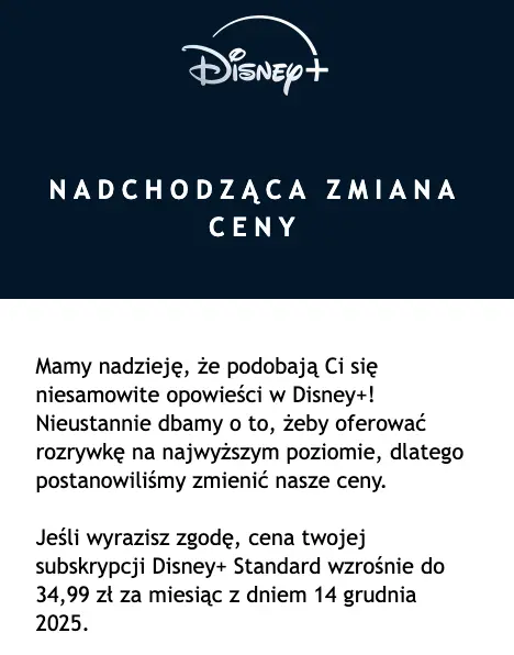 Disney+ nie chce jednak zadzierać z lokalnym prawem i narażać się urzędom. Dlatego też podwyżka przeprowadzana jest zgodnie z prawem (UOKiK wyjaśnił jak to powinno się odbywać). Dotychczasowi subskrybenci zobaczyli w swoich skrzynkach pocztowych informację dotyczącą zmian.