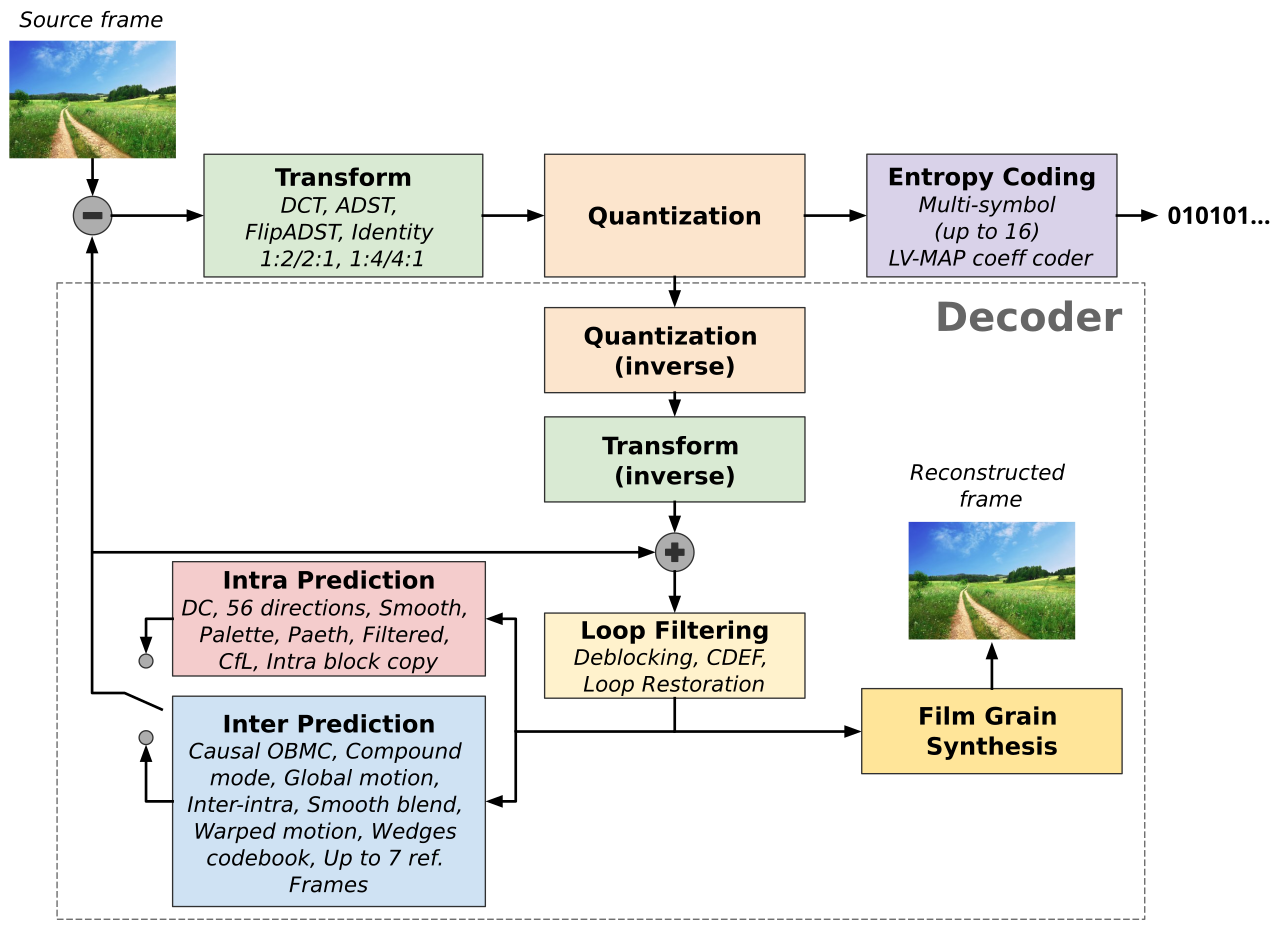 Etapy przetwarzania kodera AV1 z odpowiednimi technologiami powiązanymi z każdym etapemTo są dokładnie te obszary, w których AV1 i HEVC wyciskają dodatkowe procenty efektywności względem starszych kodeków. Bardziej sprytne przewidywanie, lepsze wykorzystanie korelacji między kanałami koloru, bardziej złożone tryby bloków – wszystko po to, by przy tym samym bitrate obraz był mniej „rozmyty” i mniej „blokowy”.