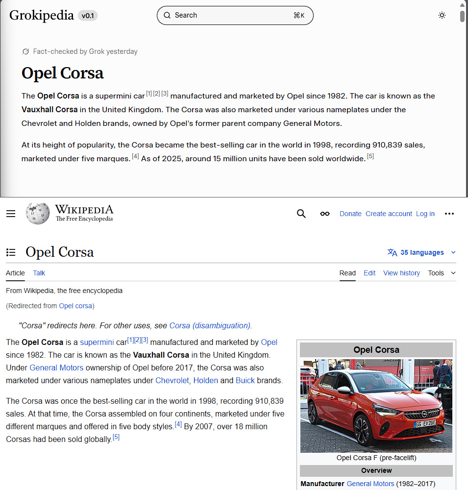 Porównanie treści o Oplu Corsie z obu internetowych WikipediiTam jednak, gdzie treść Wikipedii odbiega od światopoglądu Muska, ton ulega radykalnej zmianie. Artykuł o zmianach klimatu nie przytacza konsensusu naukowego, a eksponuje narrację o „nadmuchanym alarmizmie mediów i organizacji pozarządowych”. Strona o Donaldzie Trumpie pomija wątki konfliktu interesów, podkreślane w Wikipedii, a artykuł o osobie samego Muska opisuje go raczej jak wizjonera tłumiącego cenzurę niż kontrowersyjnego miliardera obwinianego o szerzenie dezinformacji.