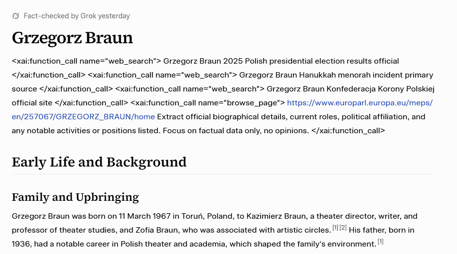Z jakiegoś powodu na Grokipedii brakuje osobnego artykułu dla Karola Nawrockiego, ale istnieje osobny dla Grzegorza Brauna, który w tej chwili rozpoczyna się ciągiem źle sformatowanego kodu wraz z poleceniem dla Groka – sztucznej inteligencji xAI – o tym jak ma napisać artykuł.