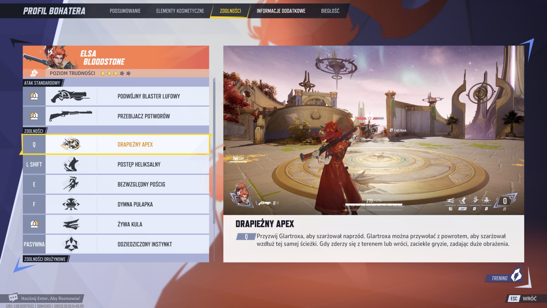 Super zdolnością Elsy Bloodstone jest Drapieżny Apex. Przyzywamy potwora zwanego Glartrox, który szarżuje naprzód. Glartoxa możemy przywołać z powrotem, aby szarżował wzdłuż tej samej ścieżki. Zdolnością pasywną Elsy jest Odziedziczony Instynkt. Zadawanie obrażeń skracam nam po prostu czas odnawiania wszystkich zdolności.
