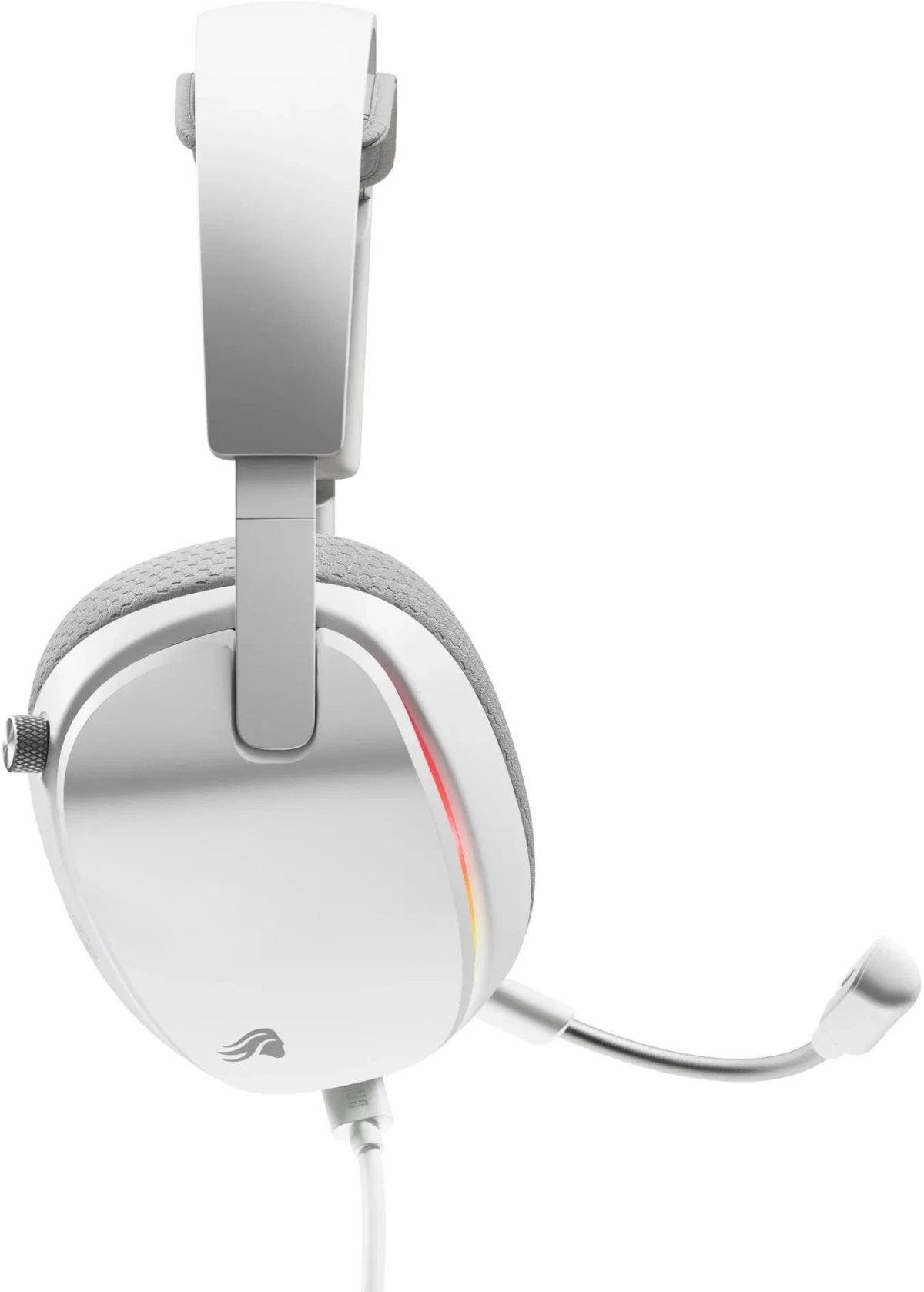 Glorious GHS Eternal RGB. | Grafika: GloriousBazowy model Glorious GHS Eternal stawia na prostotę i szeroką kompatybilność dzięki złączu jack 3,5 mm. To rozwiązanie pozwala na bezproblemowe podłączenie do komputerów, konsol czy urządzeń mobilnych bez potrzeby instalowania dodatkowego oprogramowania. W tym wariancie producent zastosował klasyczny, wyściełany pałąk oraz uproszczone sterowanie zintegrowane w jednym pokrętle, które odpowiada za regulację głośności, wyciszenie mikrofonu i podstawowe funkcje multimedialne.