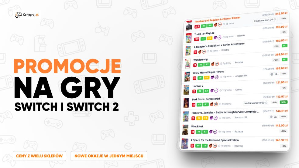 Dlatego przydatnym punktem wyjścia staje się śledzenie promocji gier pudełkowych na Nintendo Switch i Switch 2 w jednym miejscu, zamiast przeglądania każdej oferty osobno. Taki widok od razu daje szerszy kontekst i pozwala szybciej ocenić, czy obniżka rzeczywiście zasługuje na uwagę.