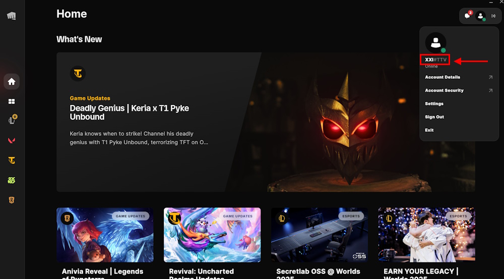 - Uruchom klienta Riot i kliknij strzałkę w prawym górnym rogu.