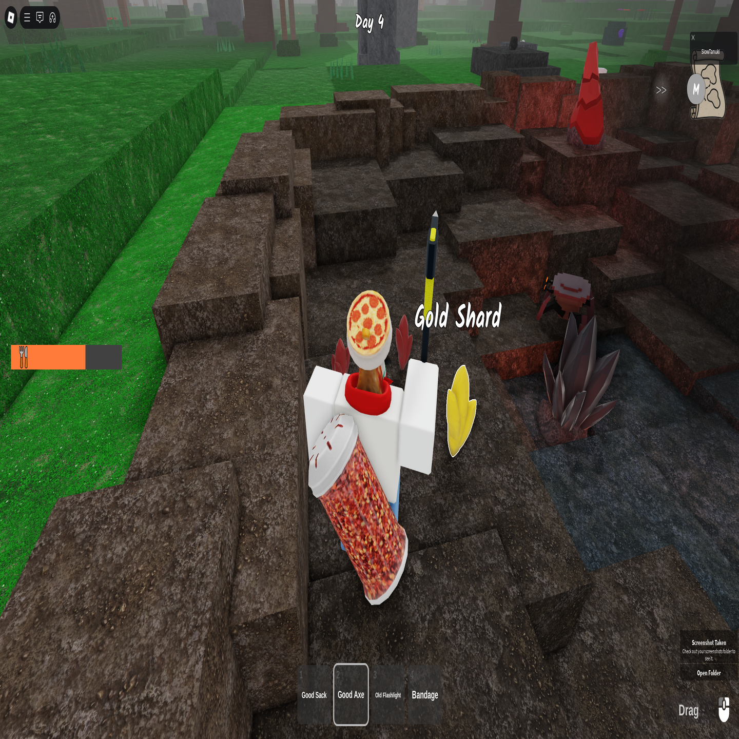 Uderz te czerwone skały toporem, a otrzymasz odłamki meteorowe i złote odłamki. Materiały te można następnie użyć w nowej wersji powracającej lokalizacji, aby stworzyć potężne przedmioty!