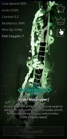 Wraz z podstawowymi statystykami ten pręt ma kilka szalonych pasywów. Kiedy łowisz łowisz z starszym prętem Mossripper w Fisch, ma szansę zwiększyć swoją wagę o 45%. Ponadto pręt ma szansę dać mutacje spcich (20%) lub mchu (5%) w Fisch. Ponadto, jeżeli MossJaw uderza, gdy używasz tego pręta, zyskujesz +30% prędkości postępu.