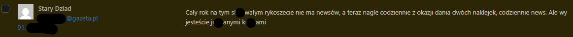 Staremu Dziadowi również życzymy wszystkiego dobrego. Również cieszymy się, iż po ostatnich 2 miesiącach kryzysu udało nam się w końcu wrócić do regularnego postowania newsów. Oczywiście zgodnie z Rykoszetową tradycją, cenzura działa i komentarz nie został opublikowany, przynajmniej nie w sekcji komentarzy.