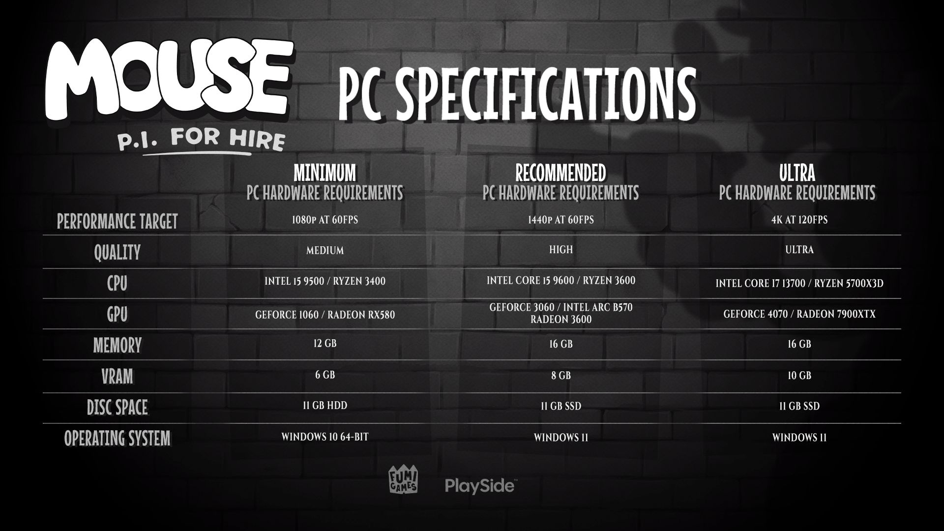 Jak widać, minimalne wymagania na komputerach dotyczą rozdzielczości 1080p w 60 klatkach na sekundę ze średnimi ustawieniami jakości. Minimalna ilość pamięci RAM to 12 GB, a VRAM – 6 GB. Warto zauważyć, iż MOUSE: P.I. For Hire nie wymaga dysku SSD – HDD wystarczy. Gra ma zajmować 11 GB. W przypadku maksymalnych ustawień zalecane jest minimum 16 GB RAM oraz 10 GB VRAM i 11 GB na dysku SSD. Czytelników Konsolowe.info powinny jednak bardziej interesować tryby działania na konsolach.