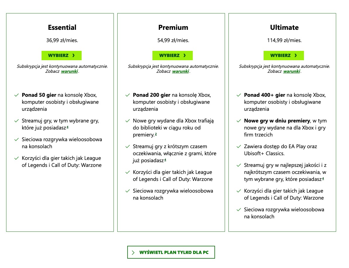 Istnieje również plan tylko dla graczy PC, który kosztuje 62,99 zł/mies., który także podrożał – wcześniej korzystał 54,99 zł/mies.