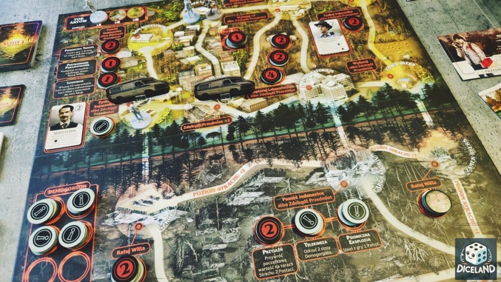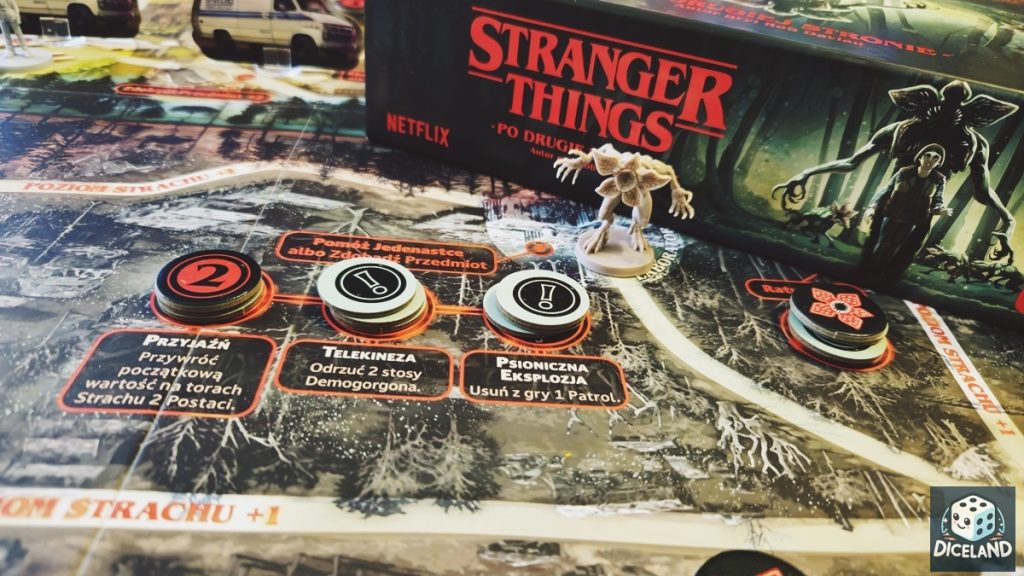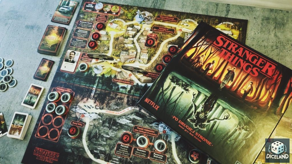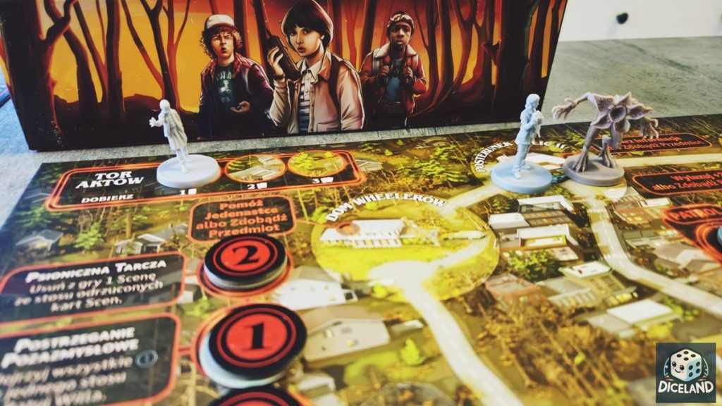 Gracze w trakcie tury poruszają się po miasteczku Hawkins, zbierają przedmioty i walczą z zagrożeniami, ale muszą uważać na talię Scen. To ona napędza grę, wprowadzając negatywne wydarzenia. W talii tej znajdziemy karty, które będą poruszać Demogorgona (lub Demopsy w okresie 2) i zwiększać poziom zagrożenia na planszy. Ciekawym elementem rozgrywki jest również obecność Jedenastki – nie jest ona grywalną postacią, ale „zasobem”, którego użycie ułatwia testy, choć wiąże się z pewnym ryzykiem.