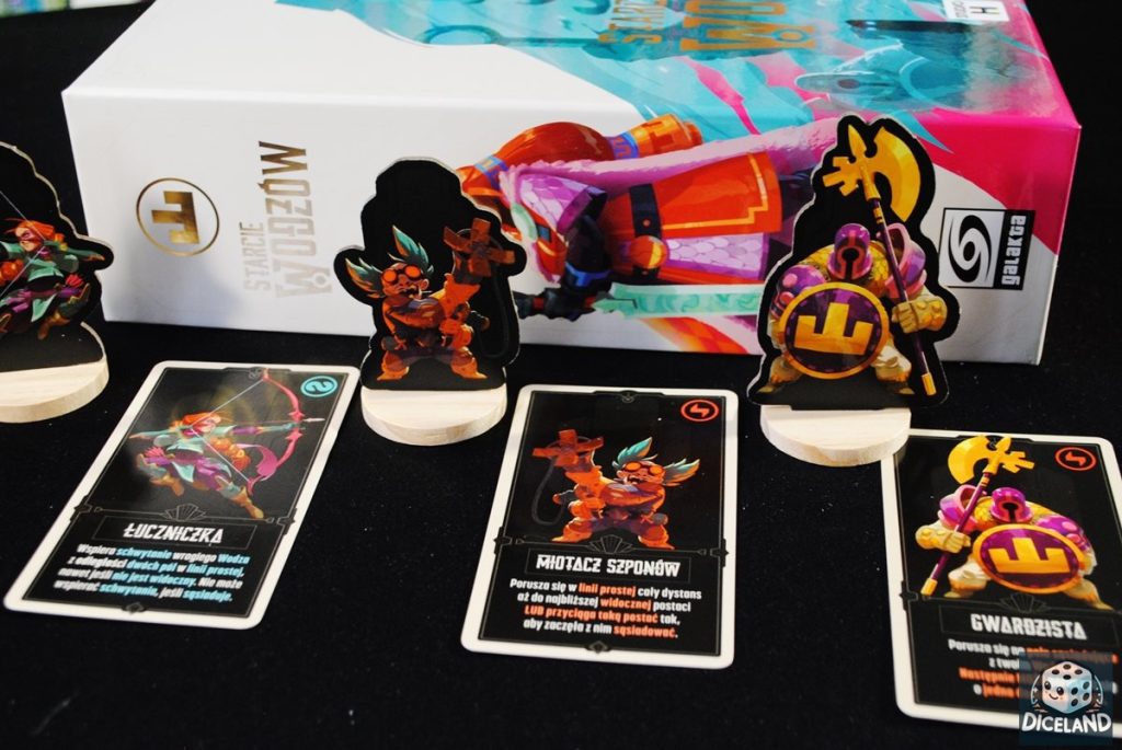 Starcie wodzów zaskoczyło mnie podobieństwem do moich ulubionych gier logicznych Warchest oraz Hive (Rój). Wszystkie te pozycje mają ten sam vibe i polegają na odpowiednim poruszaniu jednostek na planszy i umiejętnym wykorzystaniu zdolności specjalnych, którymi operujemy. To gra taktyczna, w której musimy stale reagować na ruchy przeciwnika, chroniąc swojego wodza, jednocześnie starając się atakować przywódcę przeciwnika. Ograniczona pula postaci do wyboru w rundzie, z jednej strony wprowadza nieco losowości do zabawy, a z drugiej umożliwia przetestowanie różnych układów i wzajemnych powiązań. Zaznajomieni z grą gracze mogą spróbować również wariantu zaawansowanego, w którym wszystkie postaci dostępne są do wyboru już od samego początku zabawy. Samo starcie na planszy, to już pozbawiony losowości pojedynek umysłów. Na początku zabawy zaskoczył mnie brak możliwości eliminowania wrogich jednostek. Wszystkie figury stale pozostają na planszy i mogą co najwyżej zmieniać swoje położenie.