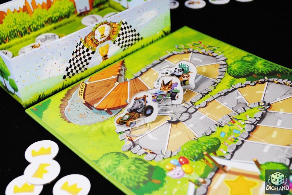 Druga gra to Wielki wyścig w Zoo. Tutaj jest nieco trudniej, a zabawa przeznaczona jest dla nieco starszych dzieci. W każdej rundzie otrzymamy nie 3, a 4 karty z „połówkami zwierząt”. Dodatkowo jedną z nich możemy zachować na kolejną rundę. Na początku zabawy wybieramy jedno zwierzątko i ustawiamy jego pionek na starcie. Następnie za każdy ułożony (dowolny) obrazek poruszamy się o jedno pole do przodu. jeżeli uda nam się ułożyć zwierzaka, którym aktualnie „jesteśmy”, w nagrodę możemy dobrać żeton korony oraz wykonać dodatkowy ruch na kolejne pole. Grę zwycięży ten, kto jako pierwszy zjawi się na mecie.