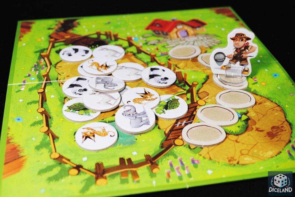 Zwiej z Zoo to tak naprawdę dwie gry w jednej. Każda wykorzystuje nieco inne elementy i różni się typem rozgrywki od drugiej. Pierwsza gra (Wielka ucieczka) to kooperacja, w której musimy „uwolnić”, jak najwięcej zwierzaków. W tym celu staramy się połączyć ze sobą jak najlepiej 3 karty i utworzyć jak najwięcej pełnych obrazków. Za każdy obrazek możemy usnąć z planszy odpowiadający mu żeton. Po piętach cały czas depcze nam jednak strażnik, który wyznacza koniec rozgrywki. Uzyskany wynik porównujemy z tabelką zawartą w instrukcji.