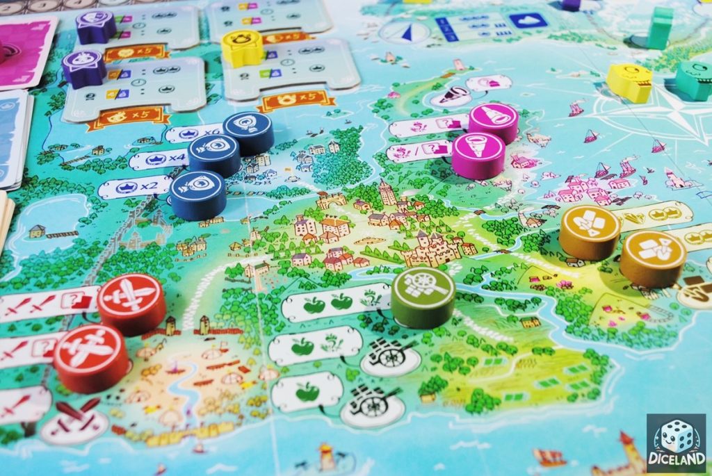 Najważniejszym elementem gry jest stworzenie dobrze prosperującego silniczka z kart. Karty będziemy wybierać 3-krotnie, w każdej fazie pozyskiwania. Przez całą rozgrywkę uzbieramy więc 12 kart towarzyszy z różnych nacji, które będą na siebie wzajemnie oddziaływać. Dodatkowo za uzyskanie przewagi w danej nacji, dostaniemy dodatkowe punkty na koniec gry. Warto więc dobierać karty świadomie i planować do przodu swoje ruchy… Tableau building nie jest jednak jedynym mechanizmem w grze. W drugiej fazie (gromadzenia) zajmiemy się bowiem umieszczaniem żetonów na planszy, czyli mechaniką worker placement. Jest to o tyle ciekawe, iż do wyboru będziemy mieć jedynie żetony, z których korzystaliśmy, rekrutując postaci. Za ich umieszczenie otrzymamy wartościowe towary potrzebne do zamówień, a także dodatkowe możliwości ruchu, czy choćby szansę na wybudowanie placówek handlowych.