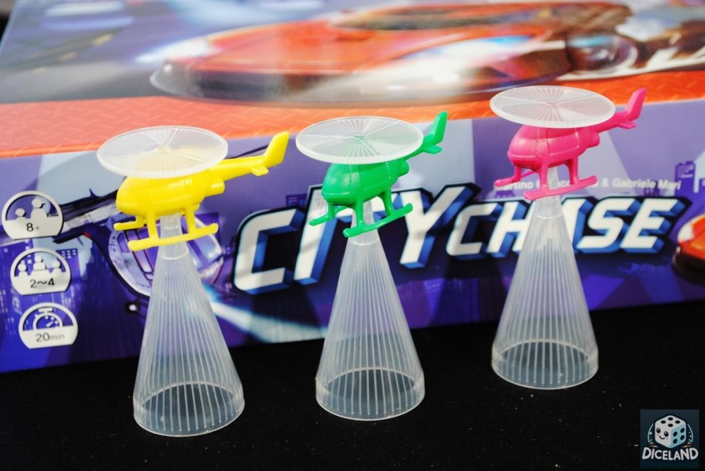 Ze względu na współpracę helikopterów, według mnie w City Chase najlepiej gra się we dwie osoby, kiedy jedna porusza się złodziejem, a druga zarządza wszystkimi helikopterami. Oczywiście rozgrywka w większym składzie też ma pewien urok – można prowadzić dyskusję nad grą i wspólnie się zastanawiać, gdzie mógł skryć się przestępca. Wspomnę o jeszcze jednym ciekawym aspekcie gry. Sporą rolę odgrywa tu… dźwięk! Może on być choćby pewnym elementem strategii. Podczas ruchu złodzieja, policjanci muszą zamknąć oczy, ale na podstawie dźwięku przesuwanych budynków mogą domyślić się, w jakim kierunku porusza się auto. Oczywiście złodziej może podnosić także inne wieżowce specjalnie dla zmylenia przeciwnika lub przeciwników.