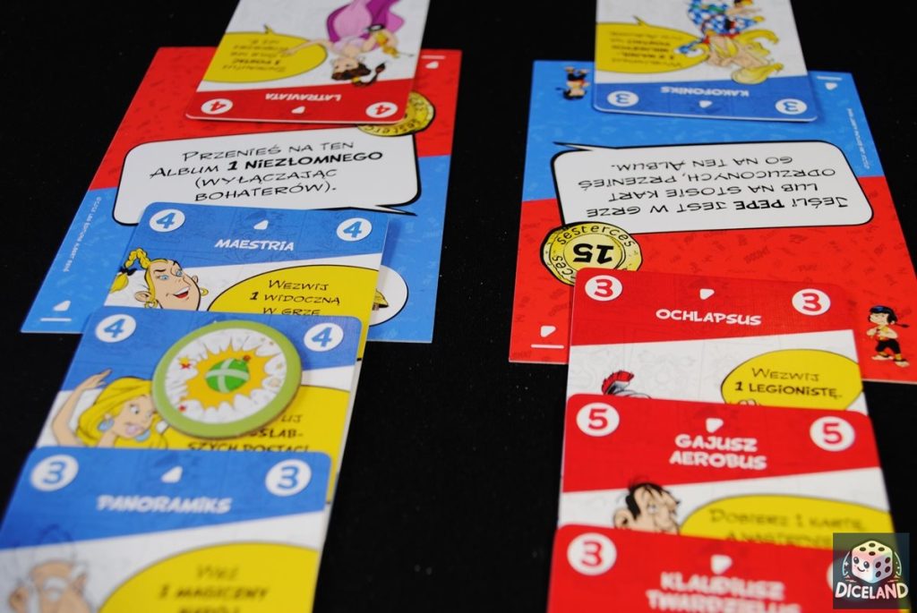 W grze duży nacisk został położony na wykorzystanie jak największej liczby postaci i grafik znanych z komiksów. To prawdziwa uczta dla miłośników Asteriksa. Znajdziemy tu zarówno ulubionych bohaterów, jak i mniej znanych Galów, czy Rzymian. Większość postaci ma różnorodne wymagania oraz użyteczne zdolności specjalne, które niejednokrotnie pozwalają mocno namieszać w czasie rozgrywki. Przepychanki nad danym Albumem są tutaj normą i nie raz przewaga któregoś z przeciwników zmienia się w ułamku sekundy. Podoba mi się, iż niepasujące karty możemy wymienić, co zwykle przynosi nam nowe możliwości psucia krwi przeciwnikom. Gra jest dynamiczna i dużo się w niej dzieje. Co chwilę coś odwracamy, przekładamy, odrzucamy i dobieramy. Dzięki temu zabawa gwałtownie się nie nudzi.
