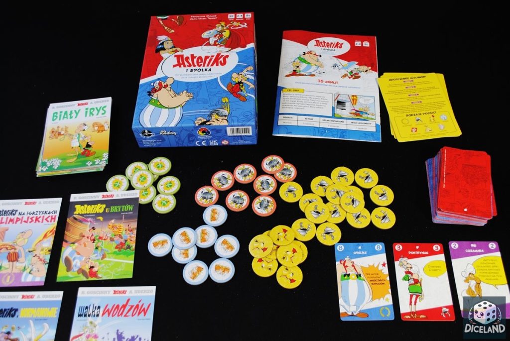 Asteriks i spółka to gra zajmująca opakowanie średniej wielkości, w którego środku znajdziemy całkiem sporo ładnie zilustrowanych elementów. Bardzo spodobało mi się zachowanie oryginalnego stylu graficznego, dzięki temu w grze spotkamy ulubionych bohaterów znanych z komiksów. Karty są ładnie wykonane, ale jak przystało na pojedynkową karciankę-warto je jednak zakoszulkować. Oprócz kart Galów i Rzymian, w opakowaniu znalazły się bardzo ładne, duże karty wybranych Albumów, które na odwrocie zawierają dodatkowe wymagania dotyczące toczącego się na nich pojedynku. Spodobały mi się również żetony specjalne, którymi możemy oznaczać dodatkowe akcje oraz punkty. Małe zastrzeżenie mam co do instrukcji, mogłaby jaśniej przedstawiać niektóre zasady i dokładniej wyjaśnić niektóre kwestie związane z zagrywaniem postaci. Na niektórych kartach pojawiły się również błędy związane z tłumaczeniem ich działania z języka francuskiego.