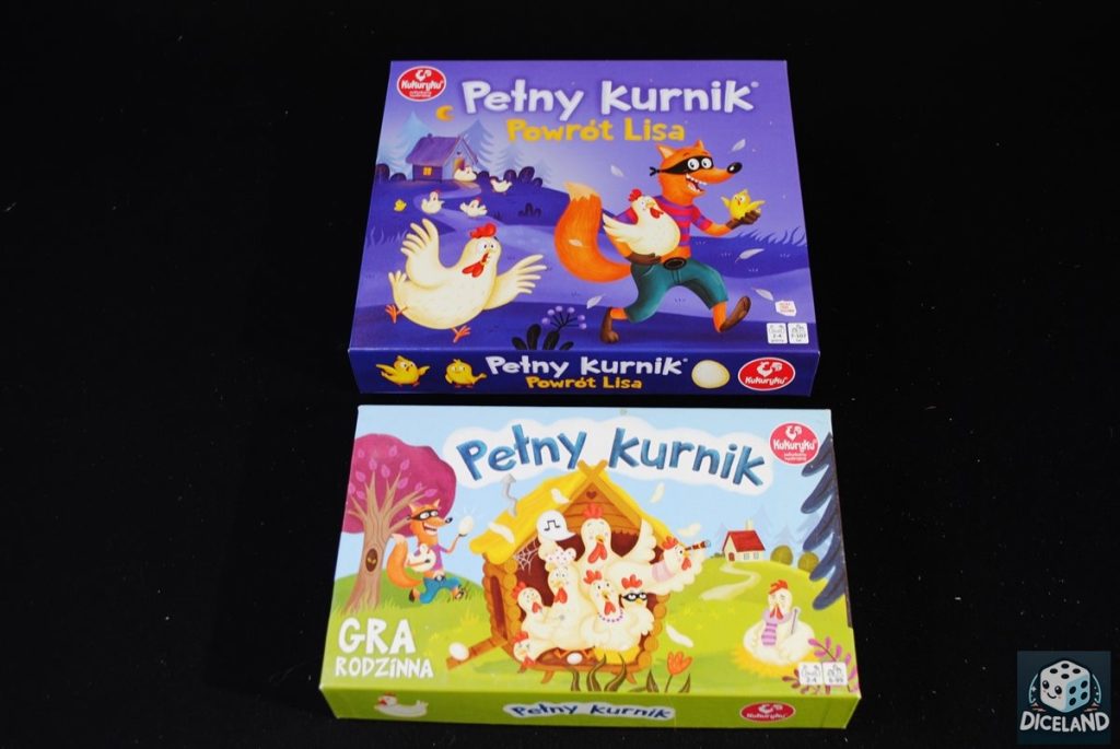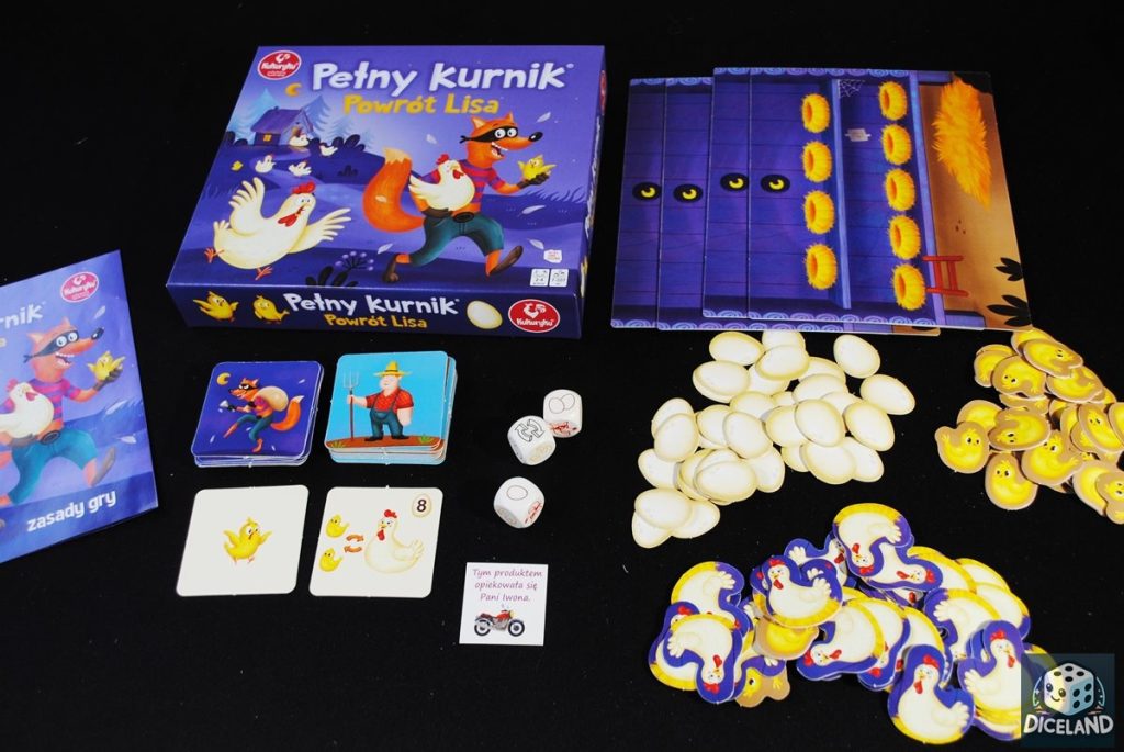 Pełny kurnik: Powrót lisa to nie tylko nowa szata graficzna i kilka nowych żetonów. Gra różni się również wielkością: pudełko jest nieco większe i wyraźnie cięższe. W środku opakowania znajdziemy mnóstwo sympatycznie zilustrowanych elementów: bardzo ładne planszetki graczy, żetony jajek, kurcząt i kur, płytki Lisa i Rolnika, 3 kostki do gry oraz dobrze napisaną instrukcję. Dodatkowo cena gry jest bardzo przystępna za to, co otrzymujemy, za Powrót lisa zapłacimy jedynie około 30 zł… W dzisiejszych czasach – coraz droższych planszówek, to bardzo atrakcyjna cena.