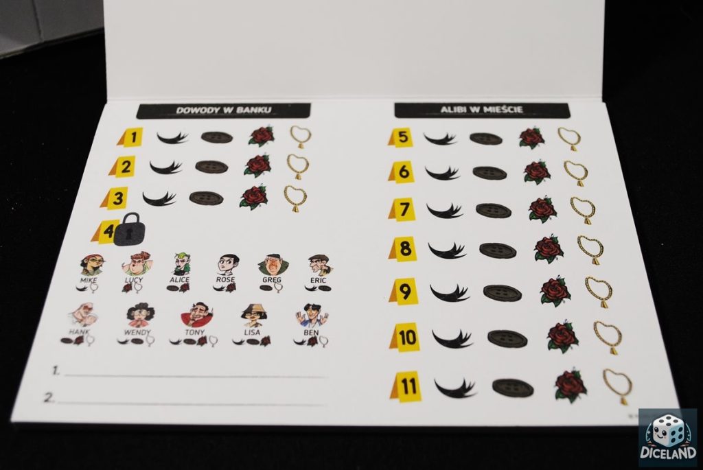 11 podejrzanych to gra zajmująca opakowanie średniej wielkości, w którego środku znajdziemy całkiem sporo ładnie wykonanych elementów. „Sercem” gry jest plansza podzielona na dwie strefy (bank oraz miasto), na których będziemy układać żetony z dowodami przestępstwa oraz z alibi niewinnych postaci. Zarówno plansza, jak i żetony zostały bardzo ładnie wykonane i dobrze prezentują się na stole. Oprócz nich w pudełku znajdziemy również drewniane meeple w 4 kolorach, karty 11 podejrzanych, karty akcji oraz moje ulubione – 4 małe notesiki detektywów do zaznaczania dowodów i alibi. Kartek jest w nich całkiem sporo, ale jeżeli chcemy, możemy je zalaminować i pisać po nich suchościeralnymi markerami – z pewnością starczą wtedy na dłużej. Do gry załączono również czytelną instrukcję, która dobrze wyjaśnia zasady rozgrywki.