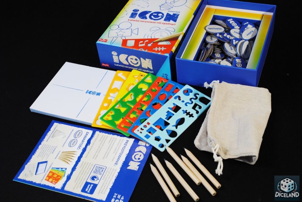 ICON to gra zajmująca zaskakująco małe pudełko w stosunku do swojej zawartości. Dużym plusem niewielkich wymiarów, jest możliwość potraktowania jej jako pozycji podróżnej. Bez problemu zmieścimy ją do plecaka i zabierzemy ze sobą na imprezę! Co znajdziemy w środku? Przede wszystkim 6 kolorowych szablonów, które posłużą nam do przedstawienia haseł dzięki rysunków. Szablony są wygodne w użytkowaniu, nieco elastyczne i zróżnicowane pod względem wyciętych kształtów. Do rozgrywki niezbędne są również hasła, zamieszczone na owalnych żetonach, które po wylosowaniu będziemy umieszczać w płóciennym woreczku. Obrazki będziemy natomiast rysować w wyznaczonych miejscach w specjalnym notesie, który posłuży również do zapisywania wyników. Notes jest niestety dość cienki i nie wystarczy na zbyt wiele rozgrywek, szczególnie iż do każdej rozgrywki będziemy potrzebowali dwóch kartek. Nie jest on jednak niezbędny do rozgrywki, więc jeżeli nie mamy możliwości zeskanowania tabelki do notowania wyników, możemy zapisywać je na zwykłej kartce. Ostatnim elementem gry jest krótka instrukcja, która dobrze przedstawia zasady rozgrywki.
