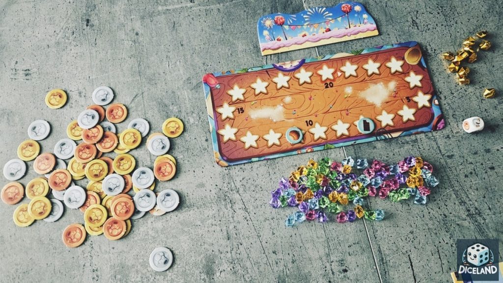 Komponenty są solidne: grube kafelki, błyszczące kolorowe „cukrowe kryształki”, czytelne planszetki i topper zwycięzcy, który świetnie wieńczy partię jak i tort zwycięzcy. Atrakcyjny wygląd gry podczas rozgrywki z młodszymi dziećmi jest istotny – aby zatrzymać ich uwagę na dłużej.