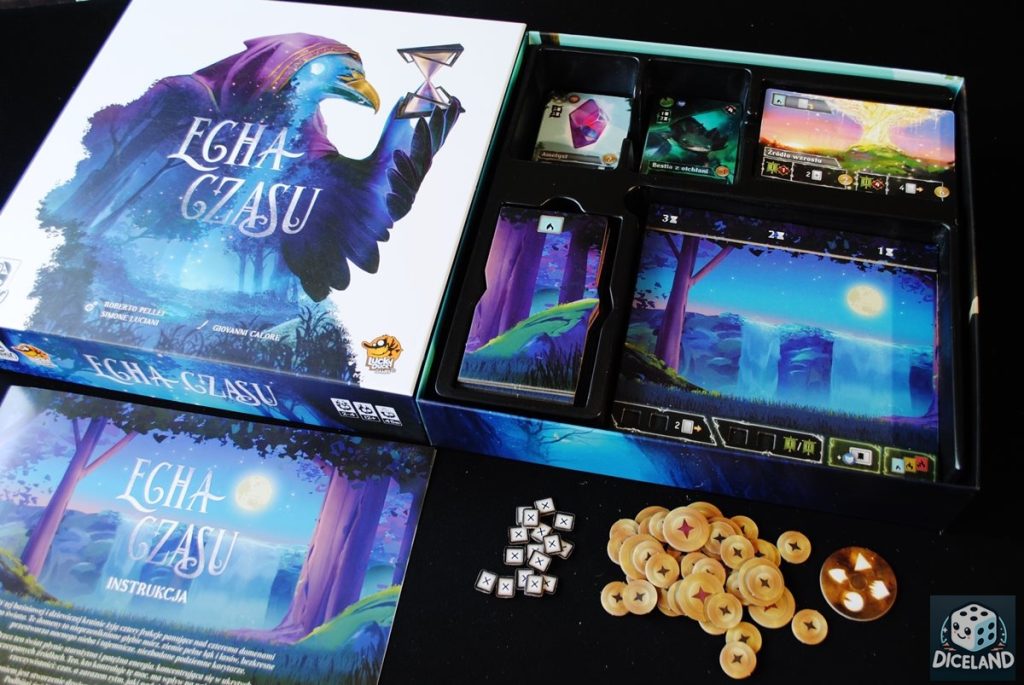 Echa czasu to gra, która zwraca uwagę bardzo ładnym wykonaniem. Najważniejsze są oczywiście fantastycznie zilustrowane karty, które rzeczywiście przypominają nieco bardziej mroczne Everdell! Na porządnie wykonanych kartach spotkamy cztery frakcje postaci (woda, niebo, ziemia i podziemia), a każda karta jest interesująca i wyjątkowa nie tylko ze względu na grafikę, ale również dzięki unikalnej mocy. Ładnie prezentują się również karty artefaktów, czyli magicznych przedmiotów, które dadzą członkom naszej drużyny dodatkowe umiejętności. Nieco gorzej wypadają na ich tle karty źródeł, jest ich na tyle mało, iż mogłyby być grubsze, a warto podkreślić, iż będą w ciągłym użyciu, bo będziemy o nie „walczyć”.