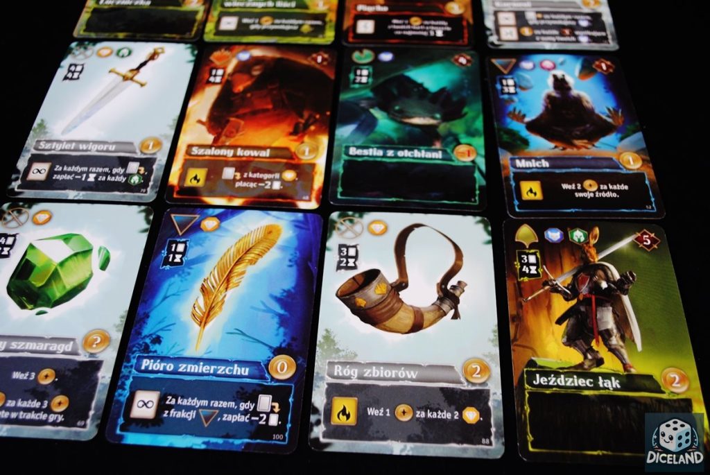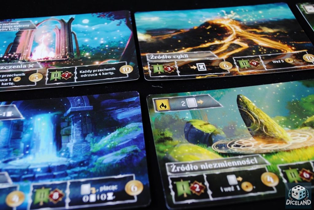 Bardzo podoba mi się przystępność tej gry. Spokojnie zagrają w nią mniej zaawansowani gracze, a i wyjadacze nie zanudzą się podczas rozgrywki, bo jest nad czym kombinować. Zaskoczyła mnie określona liczba punktów zwycięstwa, które można zdobyć podczas zabawy. Toczy się o nie prawdziwy wyścig, a jeżeli się skończą… następuje koniec gry. Podobnie jest z zagrywanymi kartami, czy ze zdobytymi źródłami. Dzięki temu gra jest naprawdę szybka, a jednocześnie nie mamy wrażenia, iż jest zbyt krótka. Spokojnie zdążymy pokombinować. A z czego wynika spora rozbieżność czasowa umieszczona na opakowaniu? Im więcej graczy tym więcej źródeł do podbicia, zabawa trwa więc odrobinę dłużej. Przy 2-osobowej rozgrywce (która swoją drogą działa bardzo dobrze) spokojnie zamkniemy się 30 minut. Przy większej liczbie graczy rywalizacja jest nieco ostrzejsza, a podbijanie źródeł bardziej intensywne i zażarte. Muszę przyznać, iż gra mnie mocno wciągnęła i z chęcią szukam nowych powiązań między kartami. Staram się również lepiej wykorzystywać moce artefaktów. Świetna zabawa, do której chce się wracać.