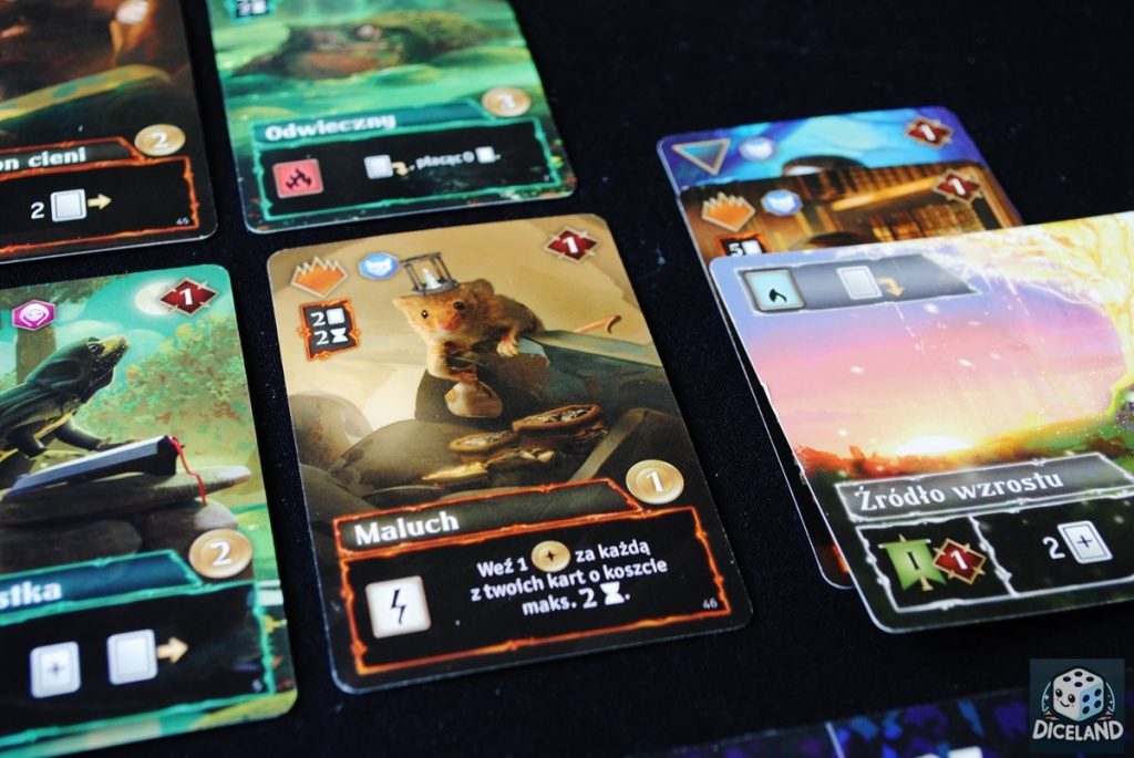 - brak przykładów działania specjalnych umiejętności na kartach,