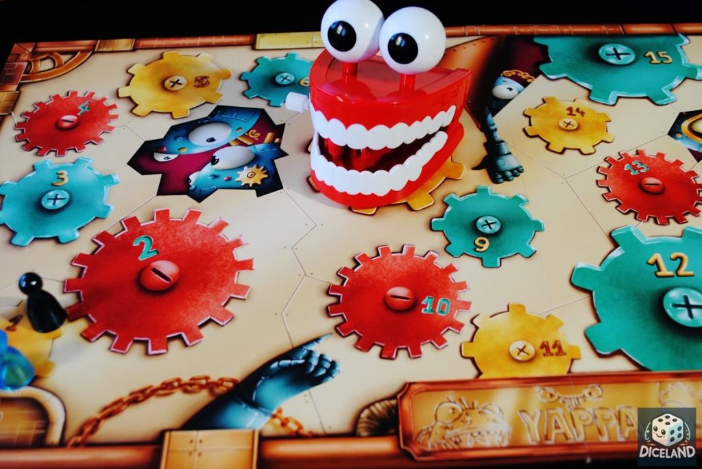 YAPPA to gra, która zajmuje dość duże pudełko, którego raczej nie weźmiemy ze sobą „na miasto”. W środku opakowania znajdziemy ciekawie zilustrowaną, „mechaniczną” planszę, prawie 200 kart z hasłami, żetony przeszkadzajek, znacznik potworka, pionki, instrukcję oraz… najbardziej atrakcyjny i niecodzienny element – nakręcaną szczękę odmierzającą czas. Dlaczego akurat taki czasomierz? Myślę, iż dla śmiechu i czegoś, co wyróżniłoby grę wśród innych gier imprezowych… Chyba nikt nie przejdzie obojętnie obok kłapiącej zębami szczęki na stole… Dla niektórych wygląda zabawnie, dla innych nieco przerażająco, ale no cóż. O gustach się nie dyskutuje. Szczękę nakręcamy „do oporu”, uważając przy tym, aby nie przekręcić jej zbyt mocno i nie uszkodzić. Zwykle kłapie zębami około 6-7 sekund.