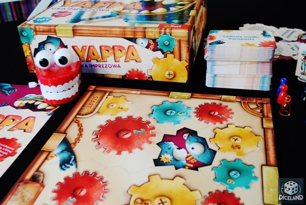 Jeśli chodzi o przebieg gry, to mamy tutaj klasyczne wymienianie pasujących słów do danej kategorii pytań. Znacie 5 sekund? Poczujecie się jak w domu… Po udzieleniu odpowiedzi, gracz porusza swoim pionkiem na planszy o odpowiednią liczbę pól, a następnie porusza pionkiem z podstawką (Panem Yappą) po kręgu żetonów z przeszkadzajkami. Żeton, na którym zatrzymał się pionek, to przeszkadzajka, która obowiązuje gracza w następnej kolejce. Utrudnienia nie są zbyt uciążliwe, są dość sympatyczne i zabawne, jak przystało na pozycję imprezową.