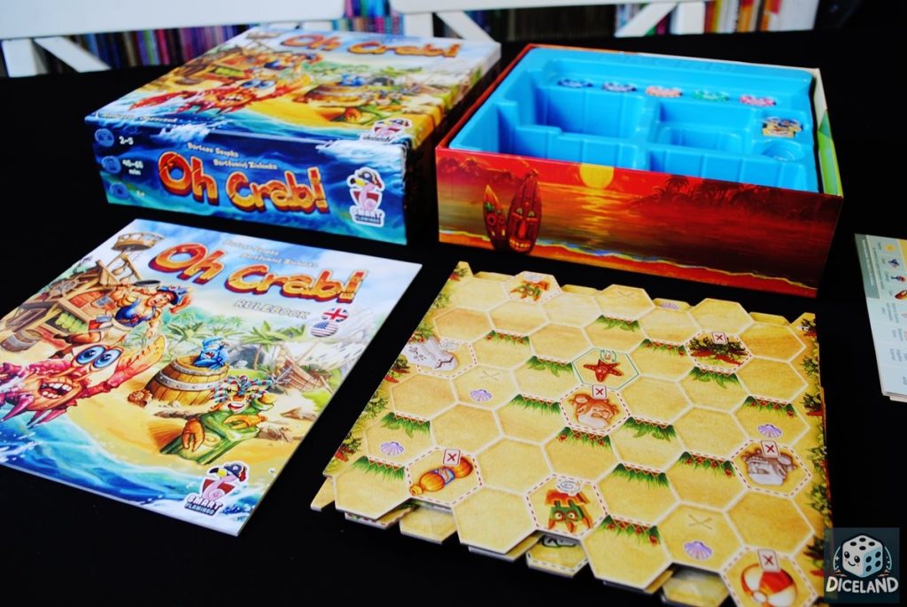 Oh Crab! to starannie wykonana gra planszowa, z interesującą, nieco komiksową oprawą graficzną. Ilustracje przypadły mi do gustu, a szczegółowe obrazki dobrze oddają klimat gry. Najciekawiej prezentuje się tutaj składana plansza, z której możemy ułożyć własną, pełną przeszkód plażę, którą muszą pokonać nasze kraby. Również poszczególne skorupiaki, w które się wcielimy, mają charakterystyczny wygląd, dzięki którym łatwo możemy je od siebie odróżnić. Na pochwałę zasługują również starannie wykonane karty i płytki. Nieco gorzej prezentuje się pionek kucharki, szkoda, iż nie został wykonany z drewna, podobnie, jak kraby. Przydatne podczas rozgrywki są także planszetki pomocy, na których znajdziemy indeks występujących w grze symboli.