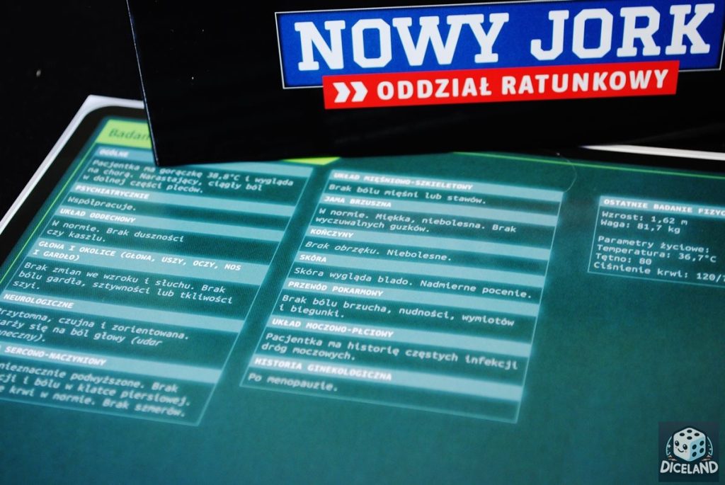 A jak wygląda rozgrywka w Ostry dyżur: Nowy Jork – Oddział Ratunkowy? Zasady są bardzo proste i polegają przede wszystkim na odczytywaniu wybranych kodów. W danym momencie gry mamy do wyboru kilkanaście możliwych akcji, takich jak przeprowadzenie wywiadu z pacjentem, zrobienie określonych badań, konsultacje ze specjalistami, podanie leków, a choćby przeprowadzenie zabiegów… Odczytujemy wybrany kod z książeczki, który przekierowuje nas dalej, nakazując np. dobranie kart fabuły lub podaje nam wynik badania, czy dodatkową informację. Po każdych 3 akcjach następuje aktualizacja stanu pacjenta… W ten sposób prowadzimy chorego, aż do rana, starając się utrzymać go przy życiu, a w najlepszym razie zupełnie go wyleczyć i wysłać do domu. Kiedy przegrywamy? jeżeli na którejś karcie fabuły dobranej podczas rozgrywki zobaczymy informację o zgonie pacjenta. Ups…
