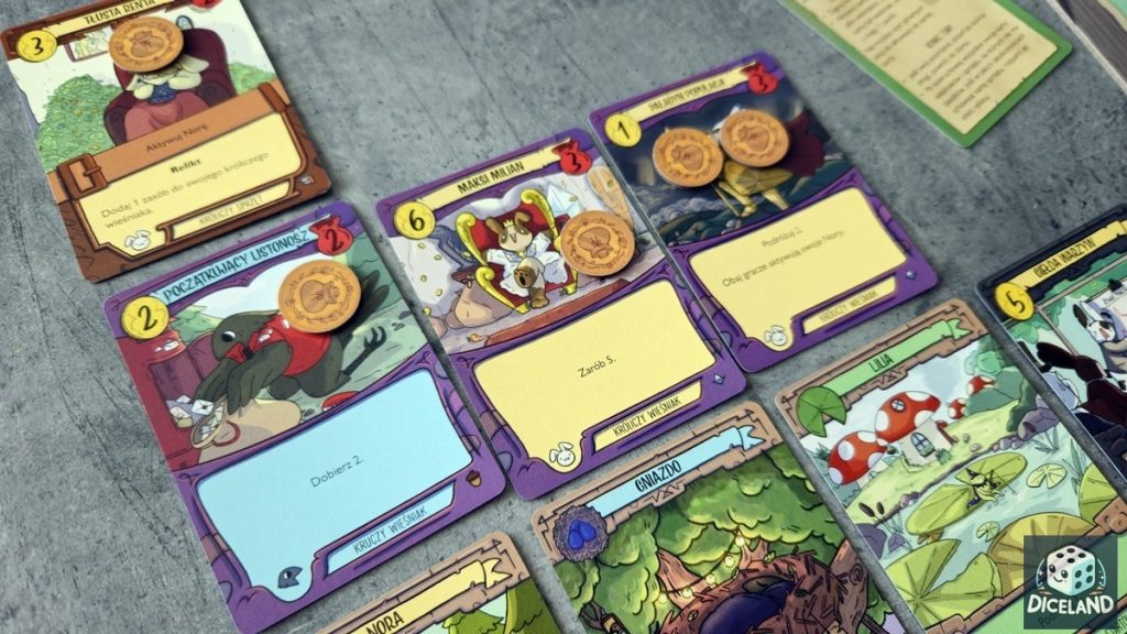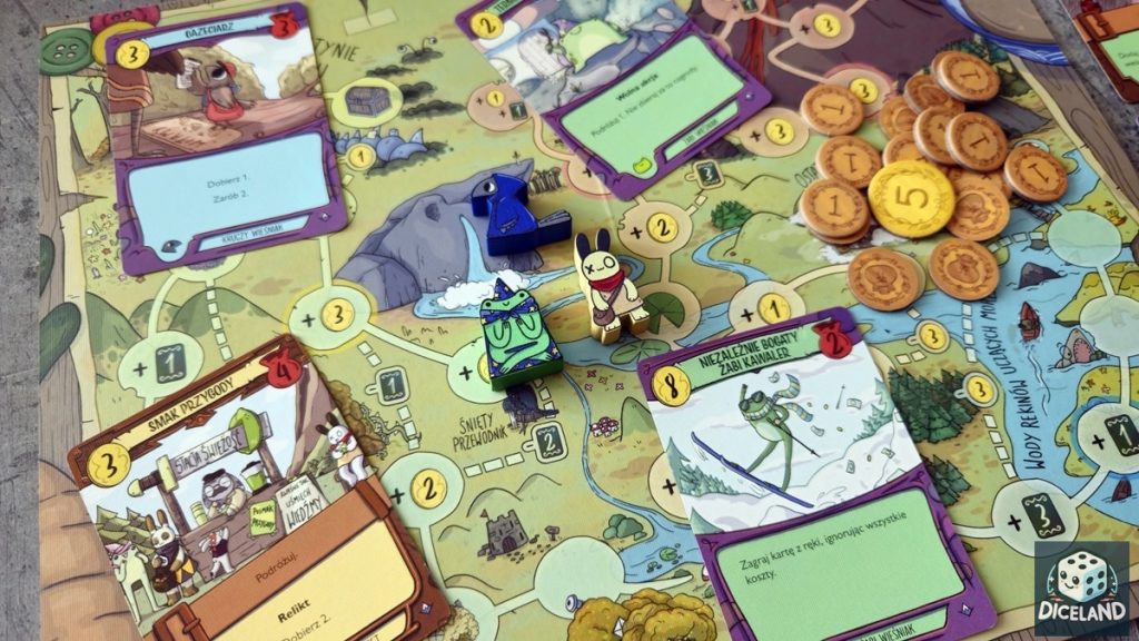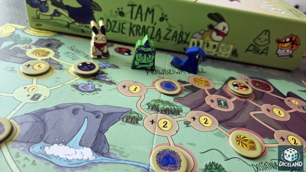 To, co jednak najważniejsze w mechanice zdobywania punktów w „Tam, gdzie kraczą żaby” to fakt, iż karty nie są wieczne i po wyczerpaniu na nich zasobów, trafiają do twojego schowka punktacji. Mechanika ta wymusza na graczu świadome balansowanie między generowaniem silnych efektów tu i teraz, a zamianie tych kart w punkty. Co więcej, z niektórych naszych kart, może korzystać nasz rywal, a więc decyzje te są jeszcze ciekawsze.