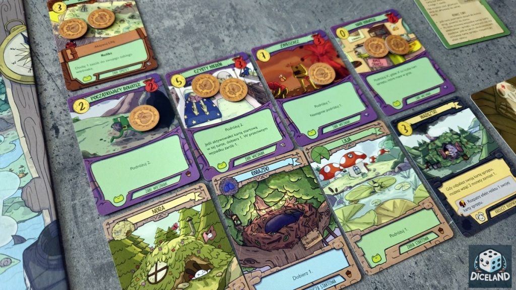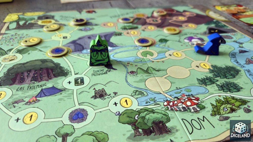 Plansza wypraw jest dwustronna (wiosna/jesień) i oferuje kilka tras z różnymi nagrodami. Na trasie naszej wycieczki możemy znaleźć: monety, nowe karty, ulepszenia startowych kart, jak i cenne skrzynie skarbów, dzięki którym możemy np. dobrać nowe karty, pozbyć się kart (dodatkowe punkty), czy też dodać zasoby do aktualnych kart. Jesienna strona planszy jest przeznaczona dla nieco bardziej zaawansowanych graczy, gdyż wymaga od nas nieraz uiszczenia opłaty za dalszą drogę. Ciekawym twistem jest również możliwość inwestycji w budynki, co przyniesie wymierne korzyści w postaci punktów na koniec gry. Możemy również skorzystać ze specjalnych żetonów zaczarowania, aby wzmocnić ich efekt.