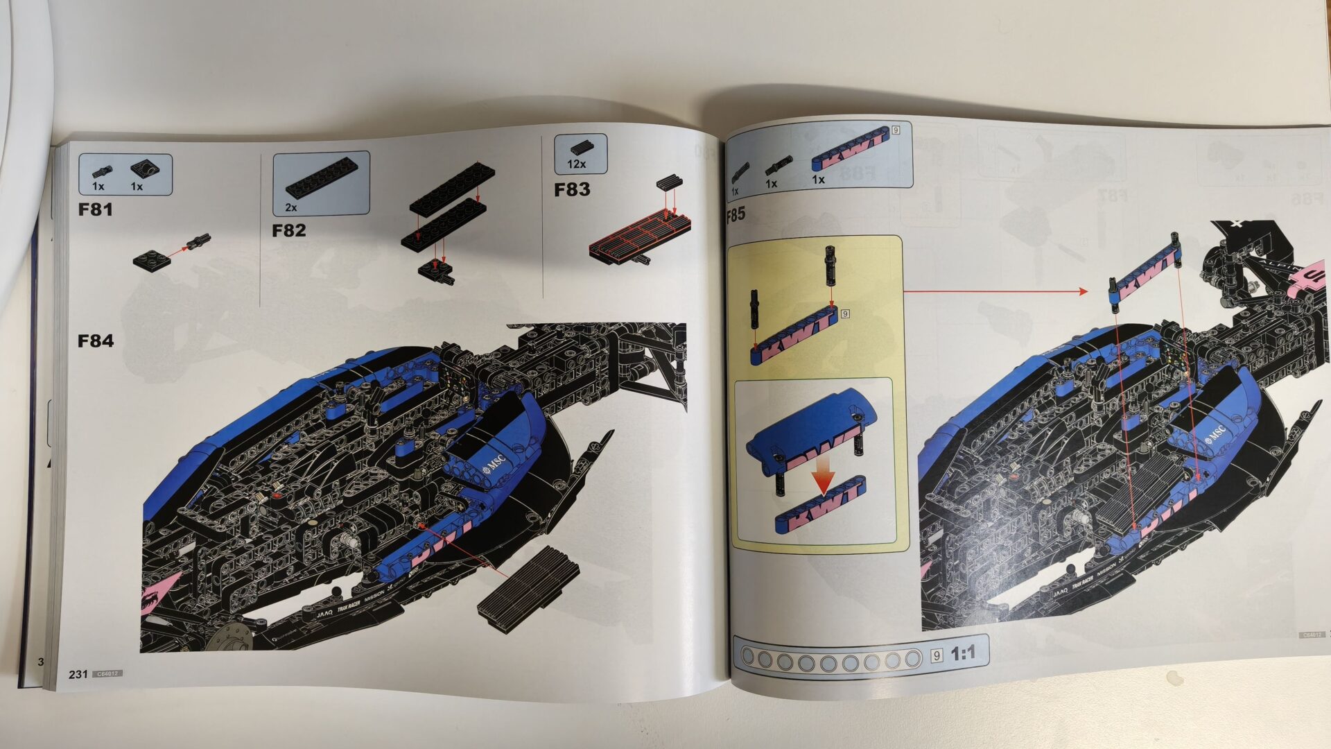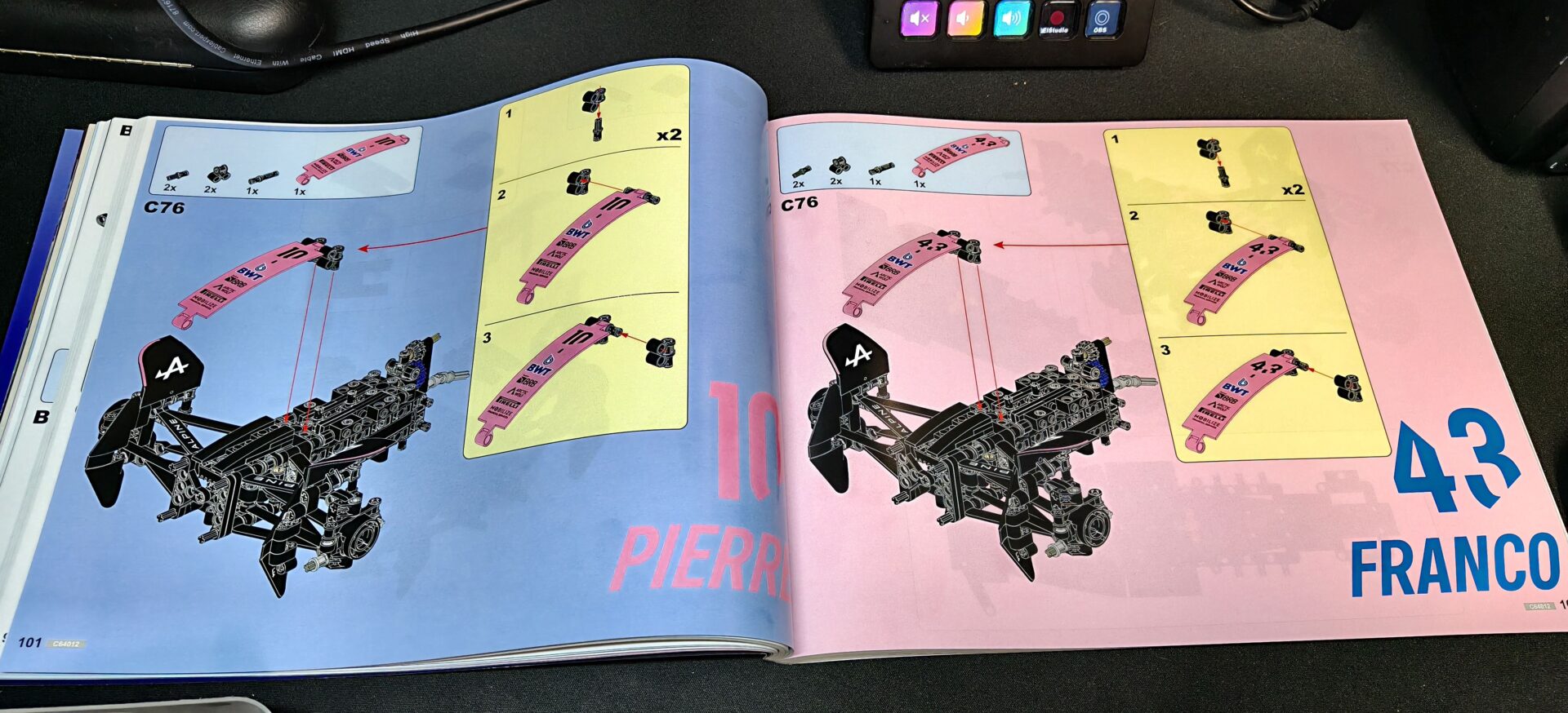 W zestawie jest oczywiście duża, obrazkowa instrukcja (330 stron), która dokładnie prezentuje nam kolejne kroki. Niestety producent nie udostępnia instrukcji elektronicznej. Na pierwszych stronach instrukcji znajdziemy historię zespołu Alpine, która zaczyna się w 2021 roku i trwa po dzisiaj. Nie brakuje tu również pięknych zdjęć bolidów z toru oraz biografii kierowców: Francuza Pierre Gasly’ego oraz Argentyńczyka Franco Colapinto. Na kolejnych stronach zobaczymy porównanie prawdziwego bolidu z jego klockowym odpowiednikiem.
