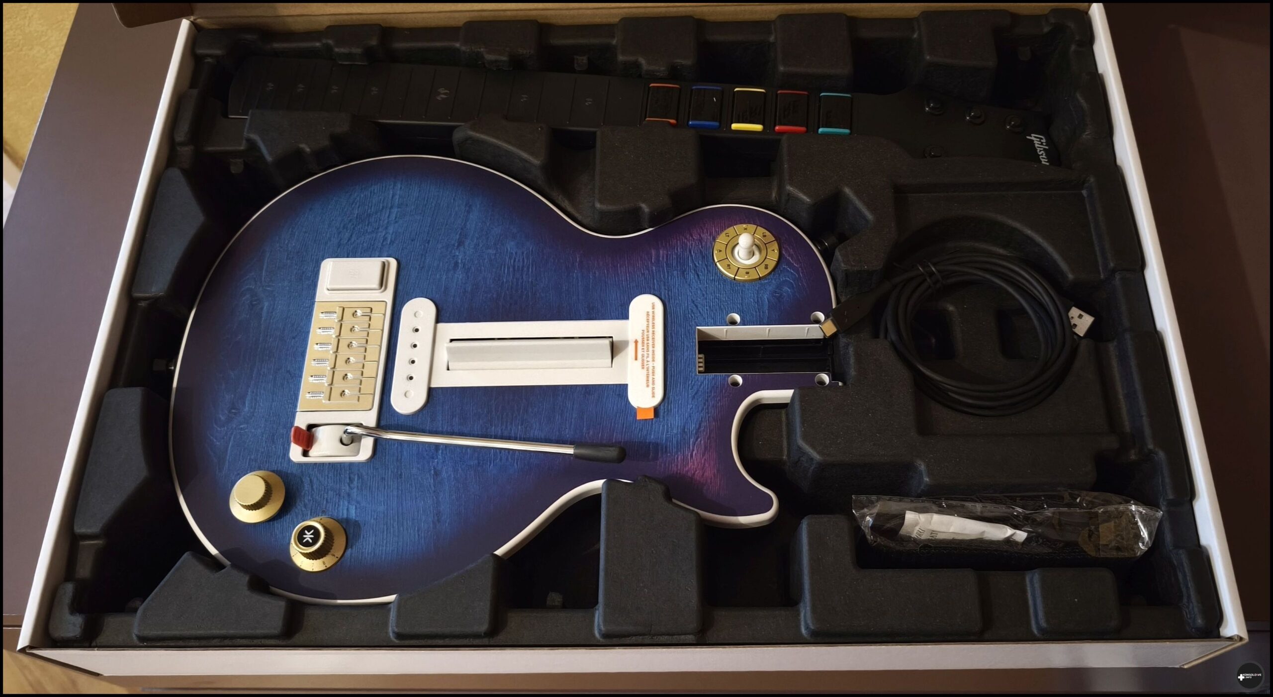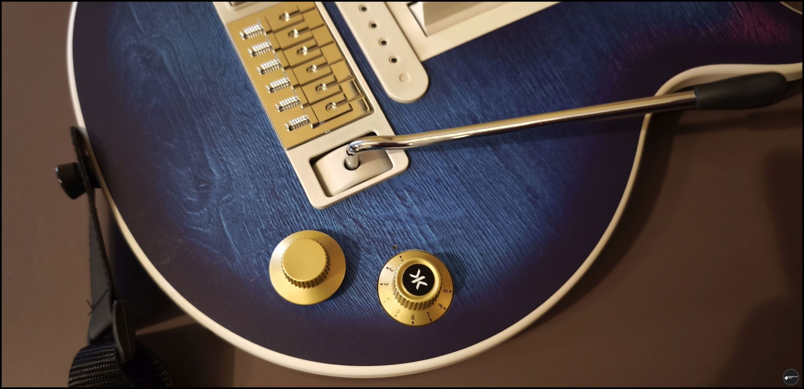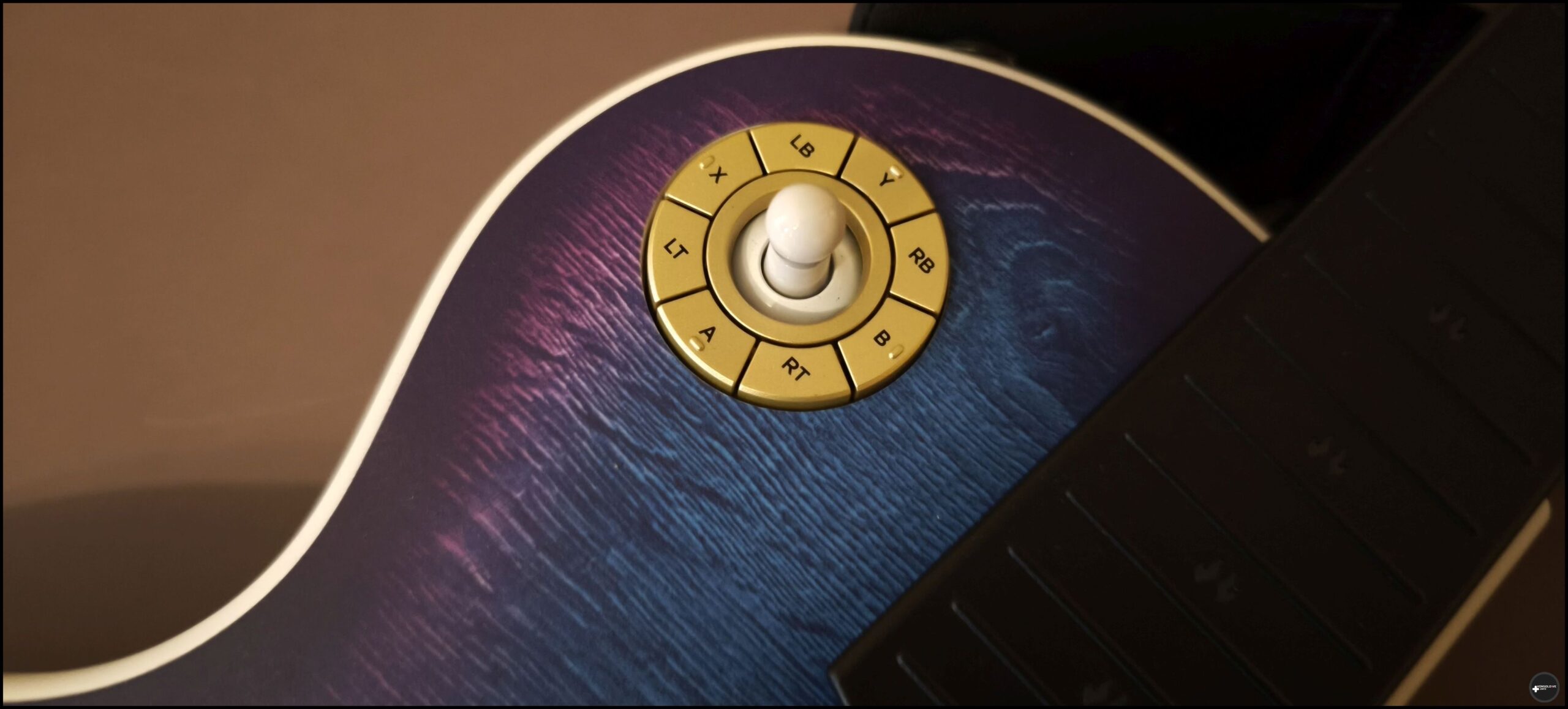 Wygląd CRKD x Gibson Les Paul jest naprawdę zachwycający. Nie dość, iż na korpusie znajdziemy przepiękną niebieską barwę jako żywą kojarzącą się z prawdziwym instrumentem, to zadbano jeszcze o rewelacyjne wykończenia przełącznika tone oraz gain. Notabene ten drugi to po prostu gałka analogowa, dzięki której możemy rozglądać się w grach. Można też zamontować alternatywne analogi jeżeli takie posiadacie. Na spodniej części główki gryfu znajdziemy krzyżaka, którego można dodatkowo oznaczyć wypukłą naklejką. Jest to bardzo przydatne dla graczy komputerowych, ponieważ na naklejce oznaczono też, jakiemu przyciskowi klawiatury odpowiada konkretny przycisk krzyżaka. Nie ma też przeszkód, aby go dezaktywować, jeżeli nie chcemy go przypadkowo wcisnąć. Gryf ma jednak dobrą szerokość i głębokość. Ani ja, ani moja żona nie mieliśmy problemu z wygodnym złapaniem „instrumentu” bez zawadzania o krzyżaka.