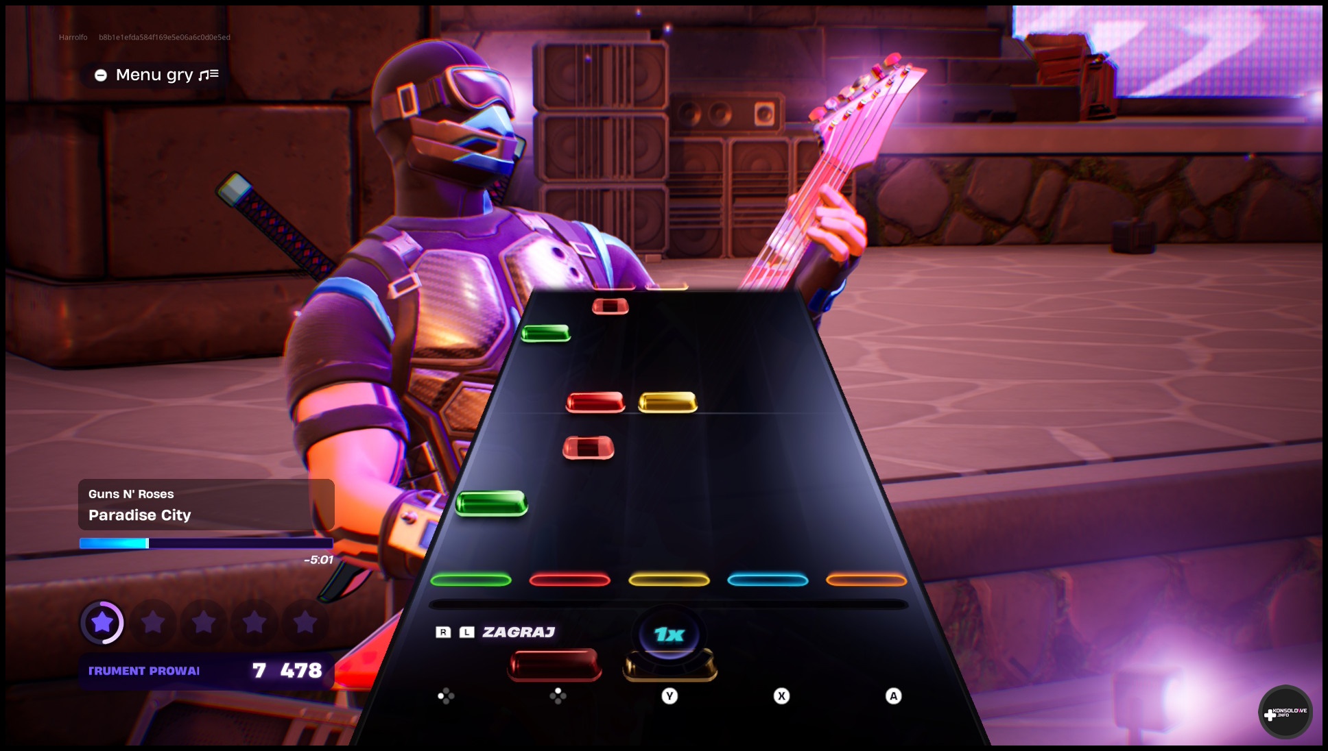 - Nintendo Switch 2 – jak już wspominałem wcześniej, gitara działa na tej konsoli zarówno przewodowo, jak i bezprzewodowo – po prostu dzięki łączności Bluetooth. Przełączamy tryb na dole gitary w pozycję NS, a następnie włączamy gitarę, naciskając przycisk CRKD. Dodajemy wtedy ten kontroler jak dowolny inny kontroler w ustawieniach Bluetooth konsoli Nintendo Switch 2 i to tyle. Możemy już grać bez najmniejszego problemu, widząc instrukcje dotyczące przycisków standardowo, jak na Switchu. Należy bowiem zaznaczyć, iż na PS5 oraz PC przez cały czas pokazywały się na ekranie klawisze klawiatury, a nie symbole konsolowych przycisków. Nie uznaję tego jednak za winę kontrolera, a jedynie za specyfikę samej gry. Co do grania, to na Nintendo Switch mamy adekwatnie jedną jedyną możliwość – darmowe Fortnite Festival. Nie zauważyłem żadnego opóźnienia podczas „wymiatania na plastikowym wiośle” i nie mogę napisać złego słowa na ten temat.