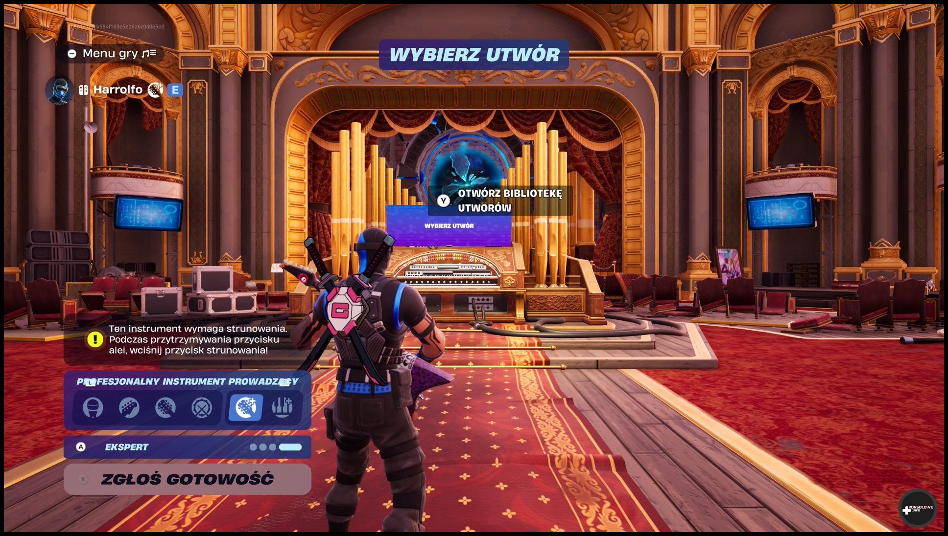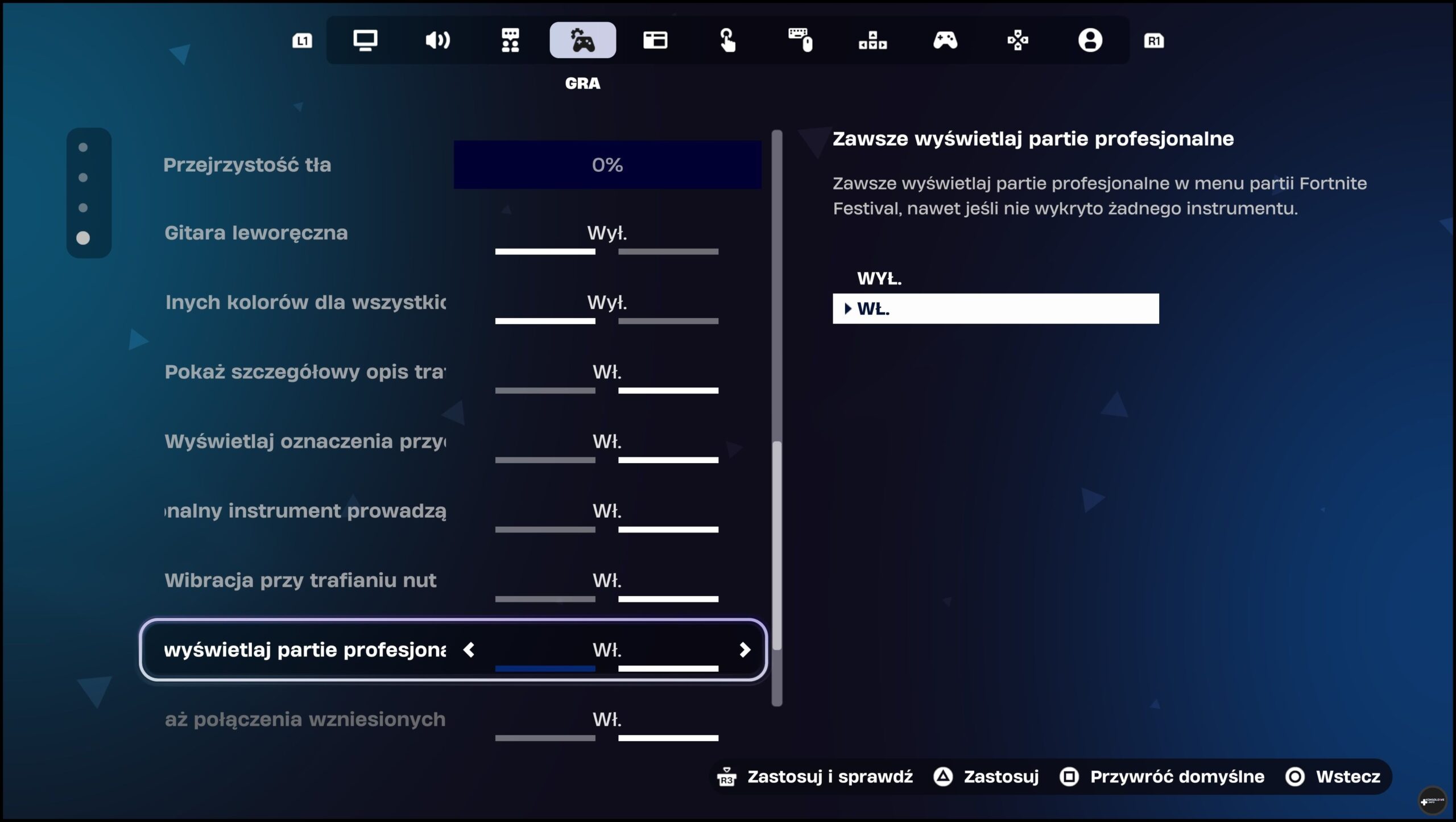 - PlayStation 5 – w przypadku tej konsoli jest również dobrze, aczkolwiek należy coś zaznaczyć. O ile bowiem producent deklaruje dedykowane Fortnite Festival automatyczne ustawienia przycisków sterowania przy gałce tone (3 oraz 4 odpowiadają odpowiednim poziomom trudności), o tyle początkowo nie byłem w stanie nakłonić gitary do adekwatnego działania w tej produkcji. Przez długi czas jedynym, co mogłem zrobić było ustawienie pokrętła na 9 i korzystanie z trybu klawiatury (Key Jam) w Fortnite Festival. Nie działało jednak wtedy „strunowanie”. Jedynie mogłem wciskać odpowiednie przyciski na gryfie w miarę ich pojawiania się na linii melodycznej. Nie było to bynajmniej najbardziej przyjemne doznanie. Okazało się na szczęście, że… w ustawieniach gry musiałem wymusić wyświetlanie zawsze instrumentów profesjonalnych.