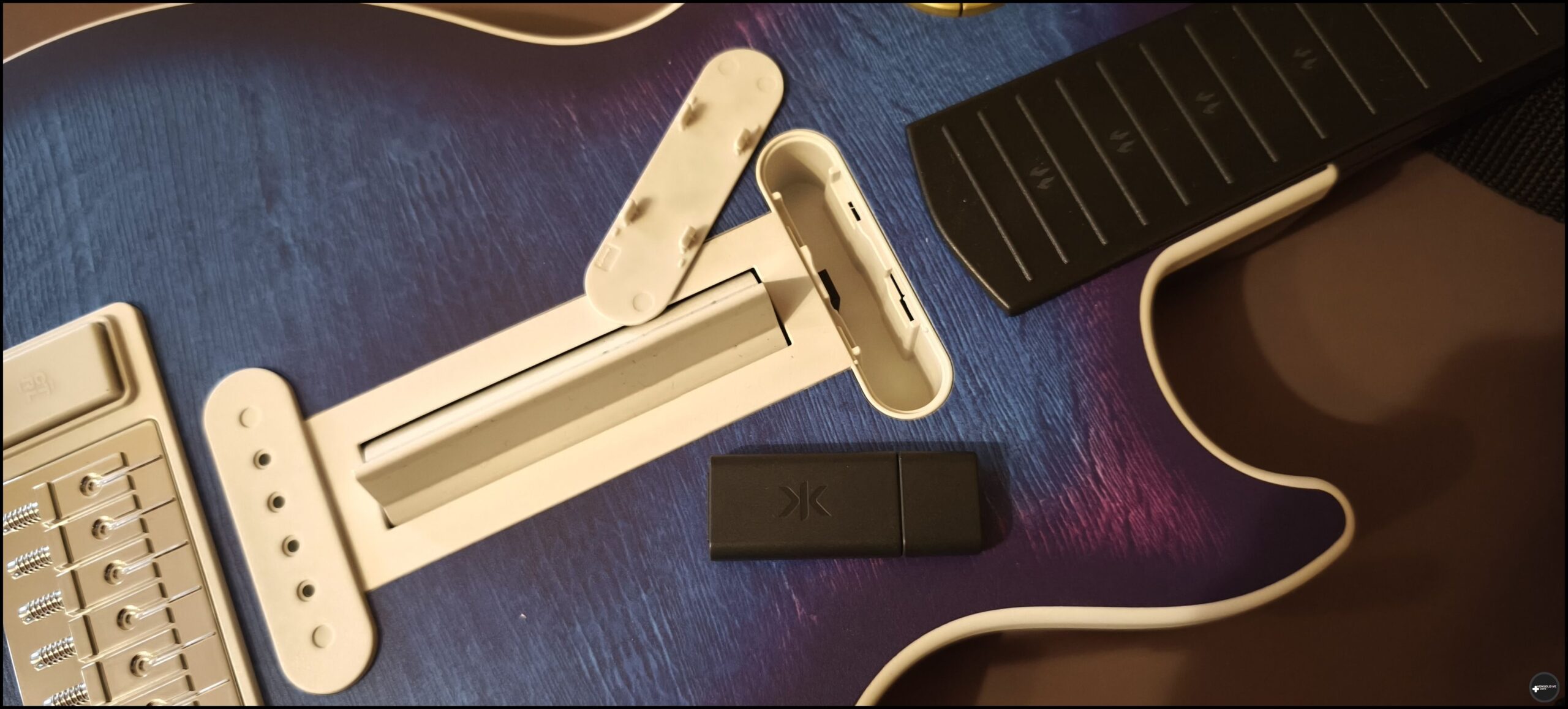 Podobnie jak w przypadku Riffmastera,CRKD pozwala na korzystanie zarówno z łączności bezprzewodowej, jak i przewodowej. Ta druga jest chyba jasna. Wkładamy po prostu końcówkę USB C kabla (dołączonego do zestawu) do odpowiedniego portu w dolnej części korpusu kontrolera, a końcówkę USB A do portu w konsoli, czy komputerze. Zapewnia to naturalnie najmniejsze opóźnienia, aczkolwiek ja nie zauważyłem ich również podczas gry bezprzewodowej. Pod górnym „przetwornikiem” CRKD jest odbiornik (dongle) USB, który wpinamy w odpowiednie urządzenie. Muszę tu zaznaczyć, iż wolałbym, aby osłona miejsca na odbiornik w gitarze łatwiej schodziła. Na początku można bowiem mieć niemałe obawy o uszkodzenie tego elementu.