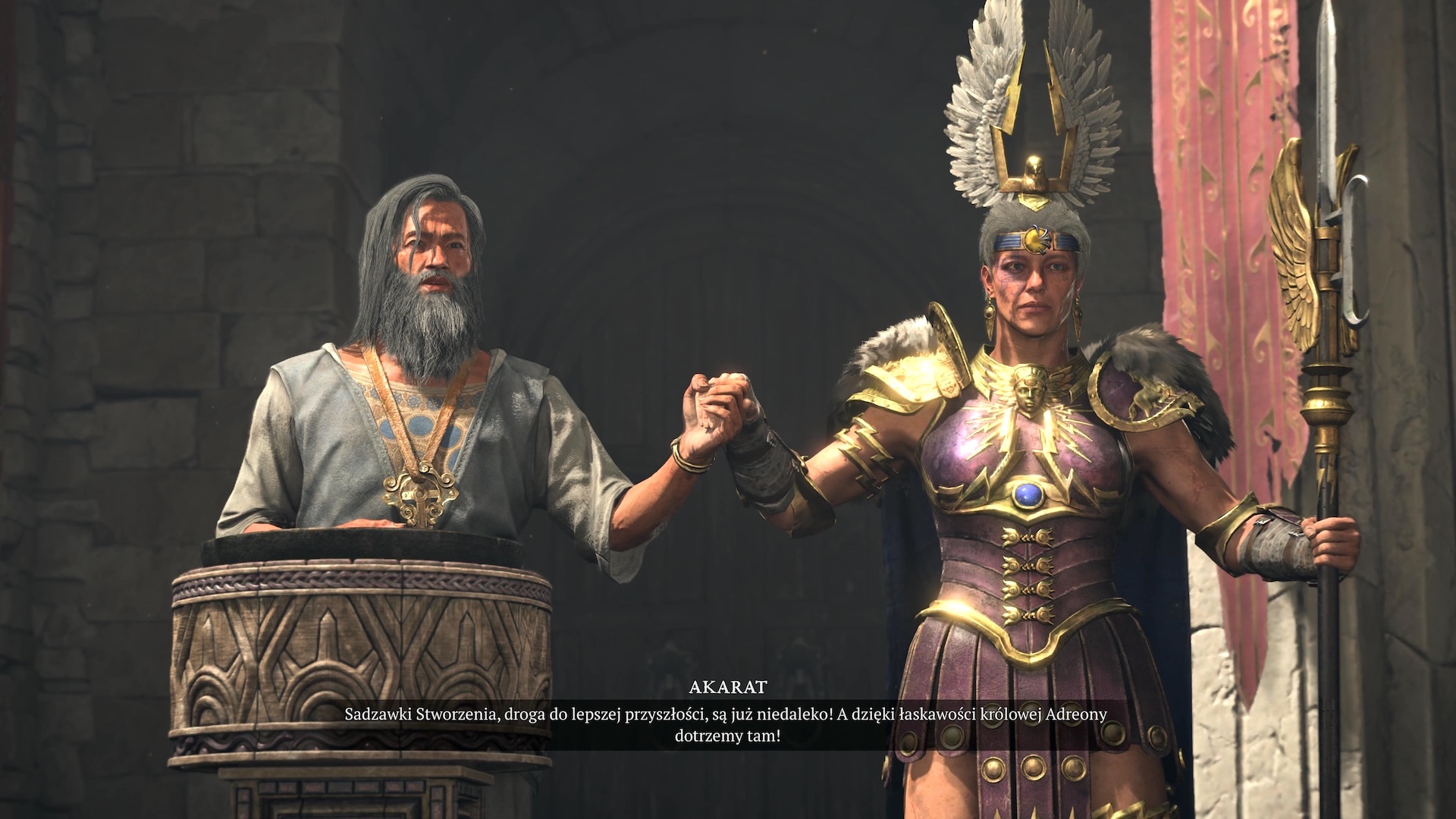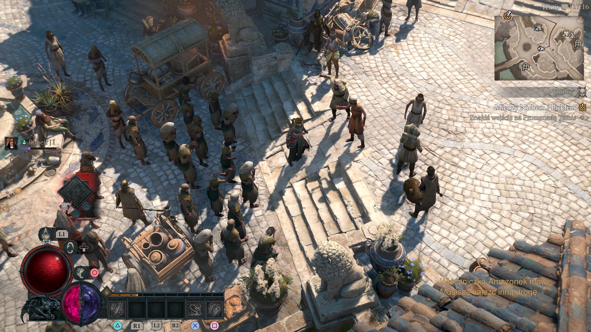 Zwłaszcza nowa aglomeracja – Temis – robi wrażenie. Zabudowa jest gęsta, budynki dosyć wysokie, izometryczny rzut kamery aktywnie filtruje kamienne budowle w ciasnych uliczkach. Do tego zdaje mi się, iż w Temis pada rekord NPC jednocześnie widocznych na ekranie. Momentami robi się naprawdę tłoczno, za sprawą pielgrzymek naiwnych wyznawców Akarata.