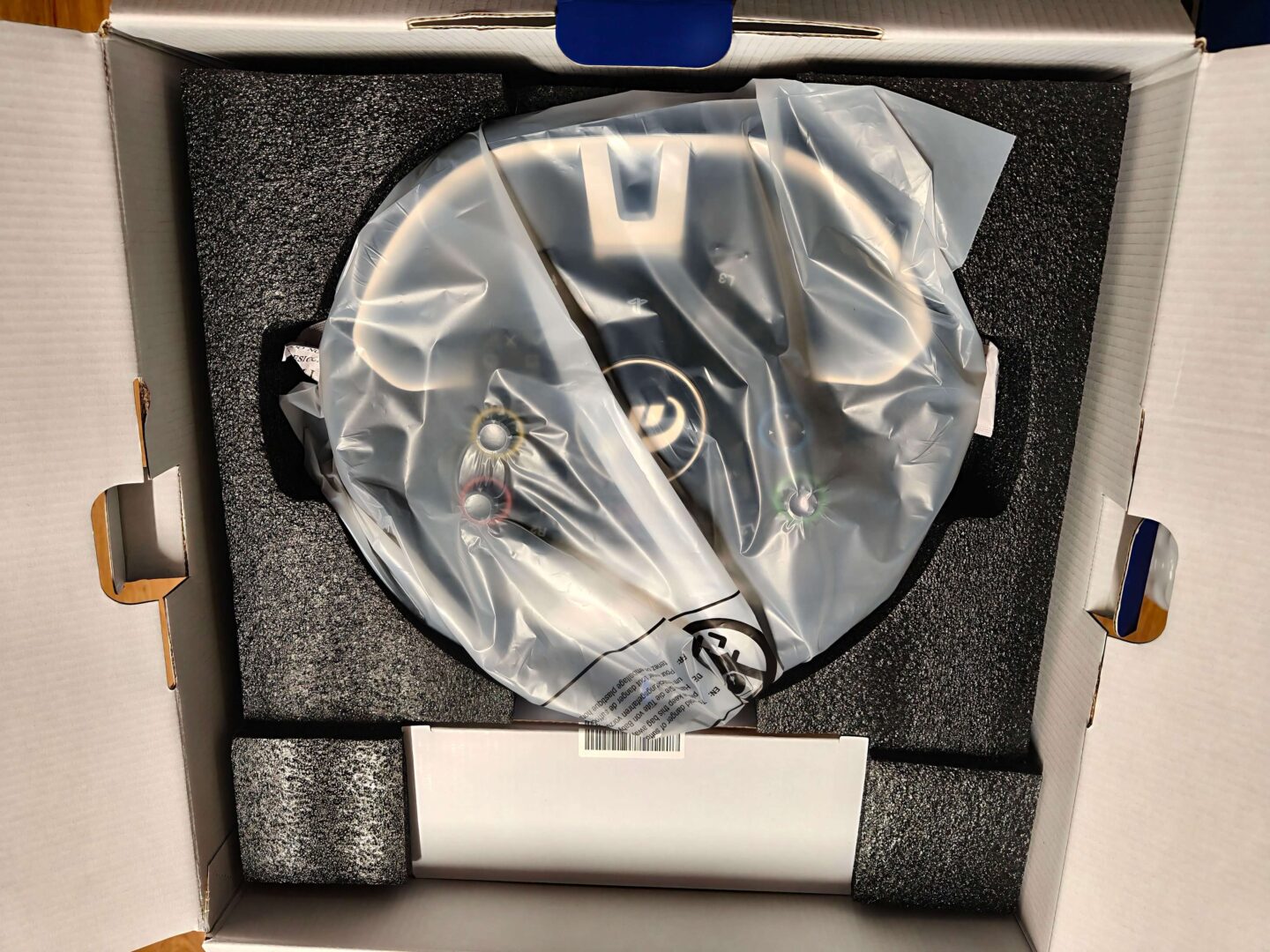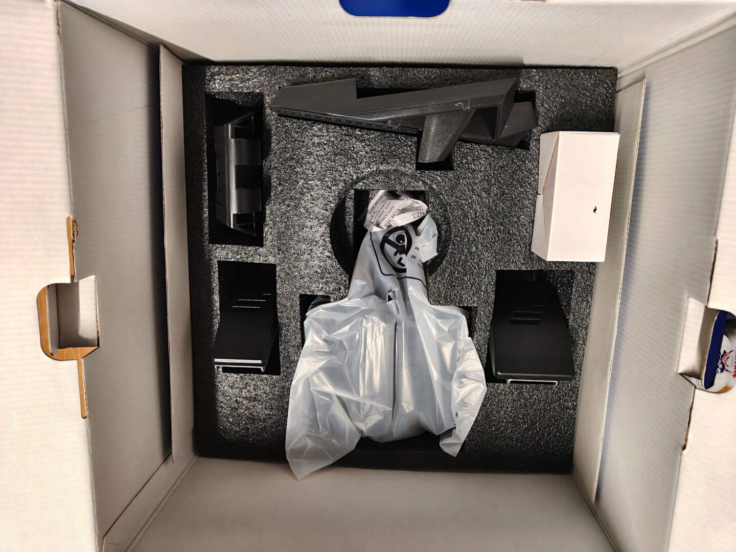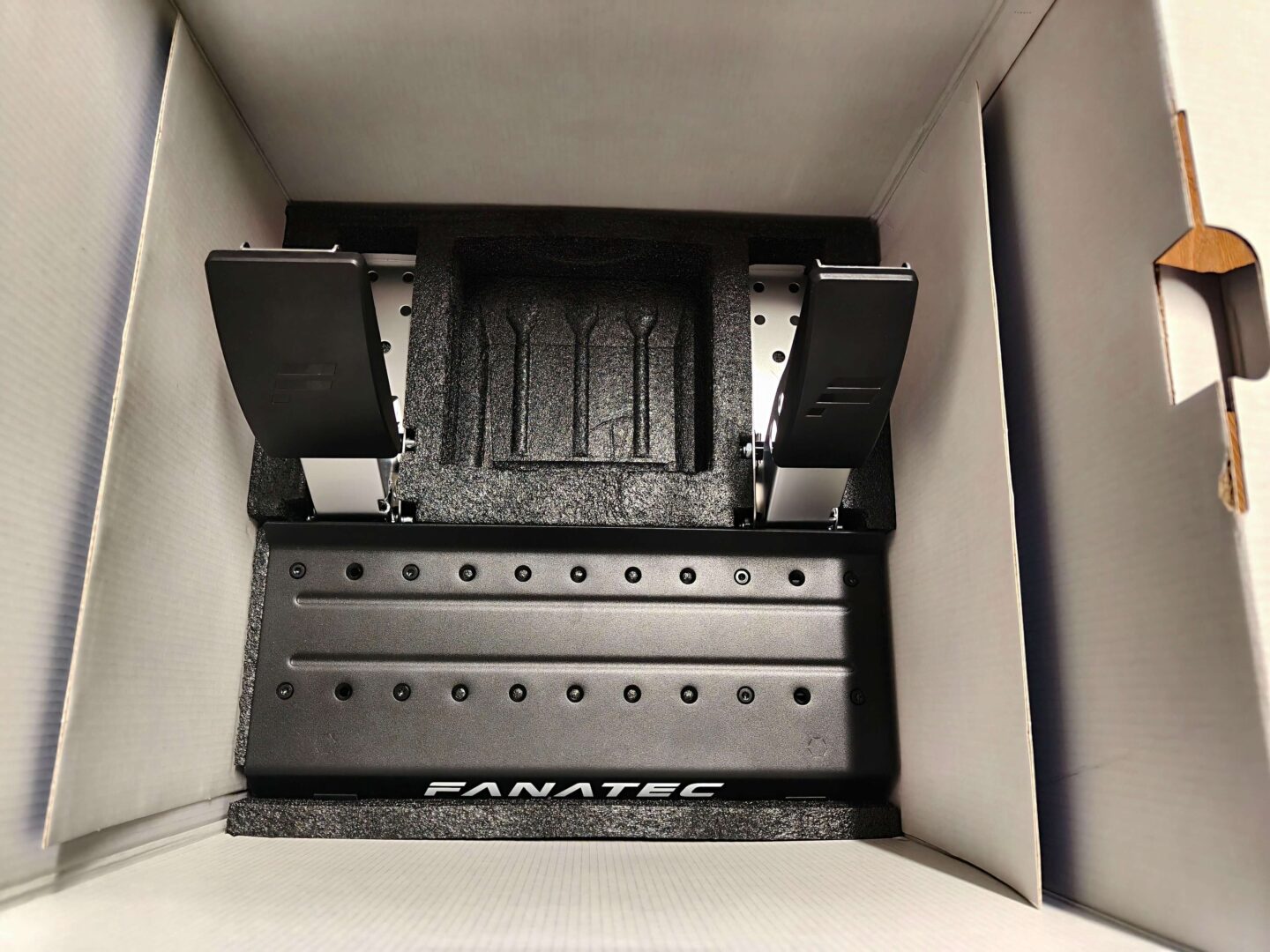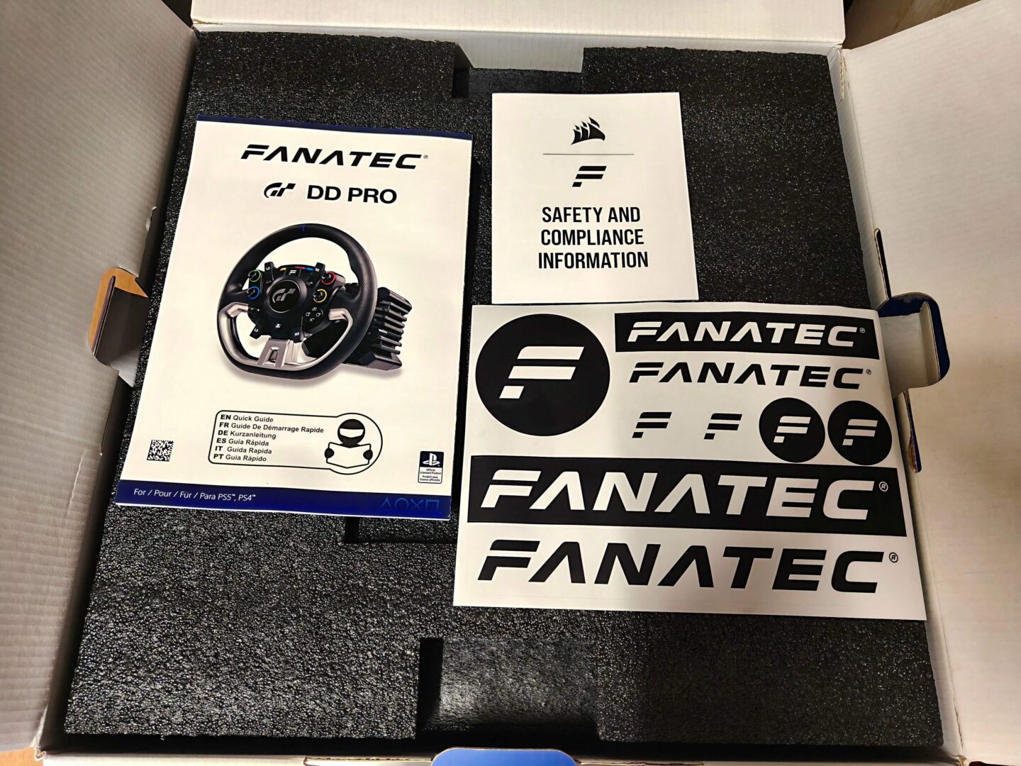 FANATEC Gran Turismo DD Pro trzyma się dobrze znanego stylu, który widzieliśmy już na opakowaniach kierownic Thrustmaster T598 oraz Logitech RS50. Otrzymujemy duży karton z białym tłem, zdjęciem produktu na środku, niebieskim paskiem u dołu, oraz informacji o oficjalnej licencji od PlayStation. Rozpakowując zestaw wyścigowy, od góry widzimy instrukcję szybkiego montażu oraz zestaw naklejek z logo firmy Fanatec. Na samej górze umieszczono obręcz kierownicy oraz pudełko z zasilaczem 90 wat (5 Nm). Drugie piętro kryje bazę GT DD Pro, uchwyt do blatu oraz pudełko z kabelkami. Na samym dole znajdziemy oczywiście manipulatory nożne.
