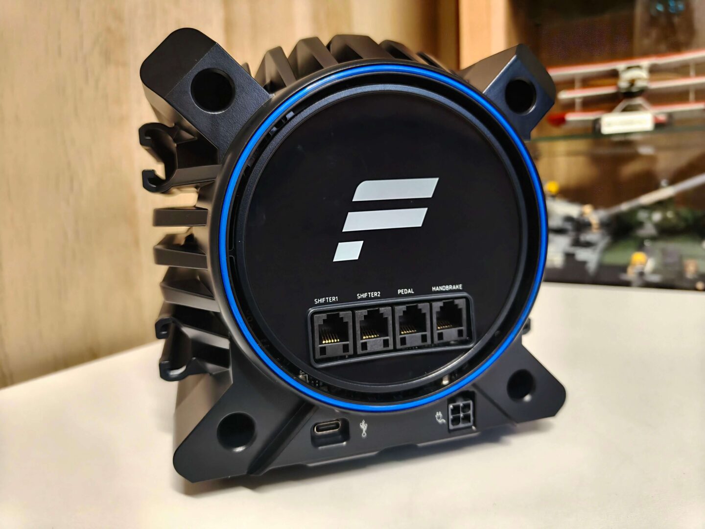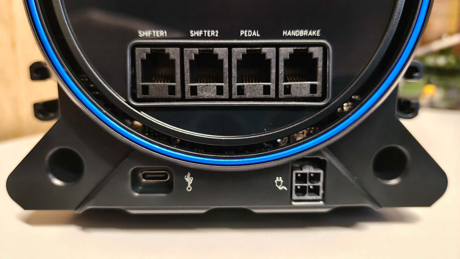 Z tyłu kierownicy znajdziemy sześć portów, z czego tylko jeden jest portem USB, służy on do podłączenia bazy do konsoli lub PC. Wszystkie akcesoria do bazy podłączamy dzięki kabla RJ12. Wśród akcesoriów możemy podłączyć shifter sekwencyjny, skrzynie biegów w układzie H, hamulec ręczny oraz oczywiście manipulatory nożne.
