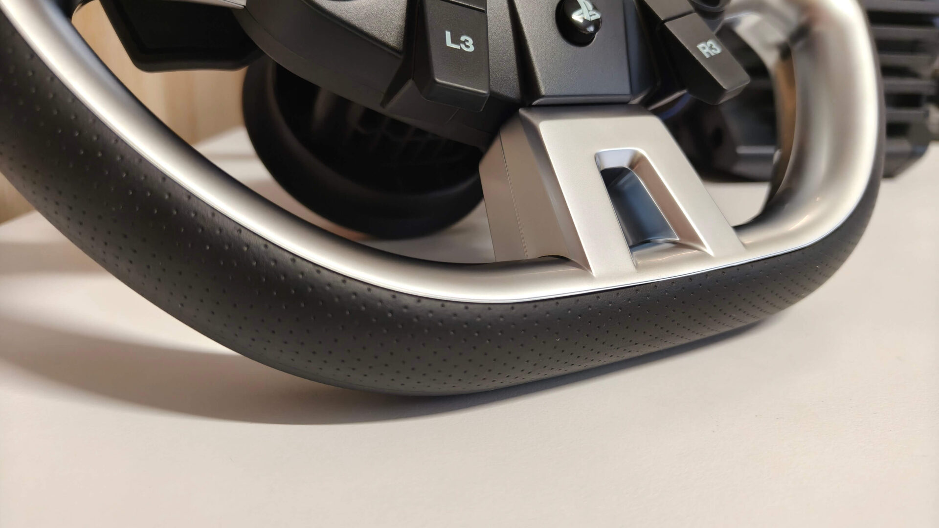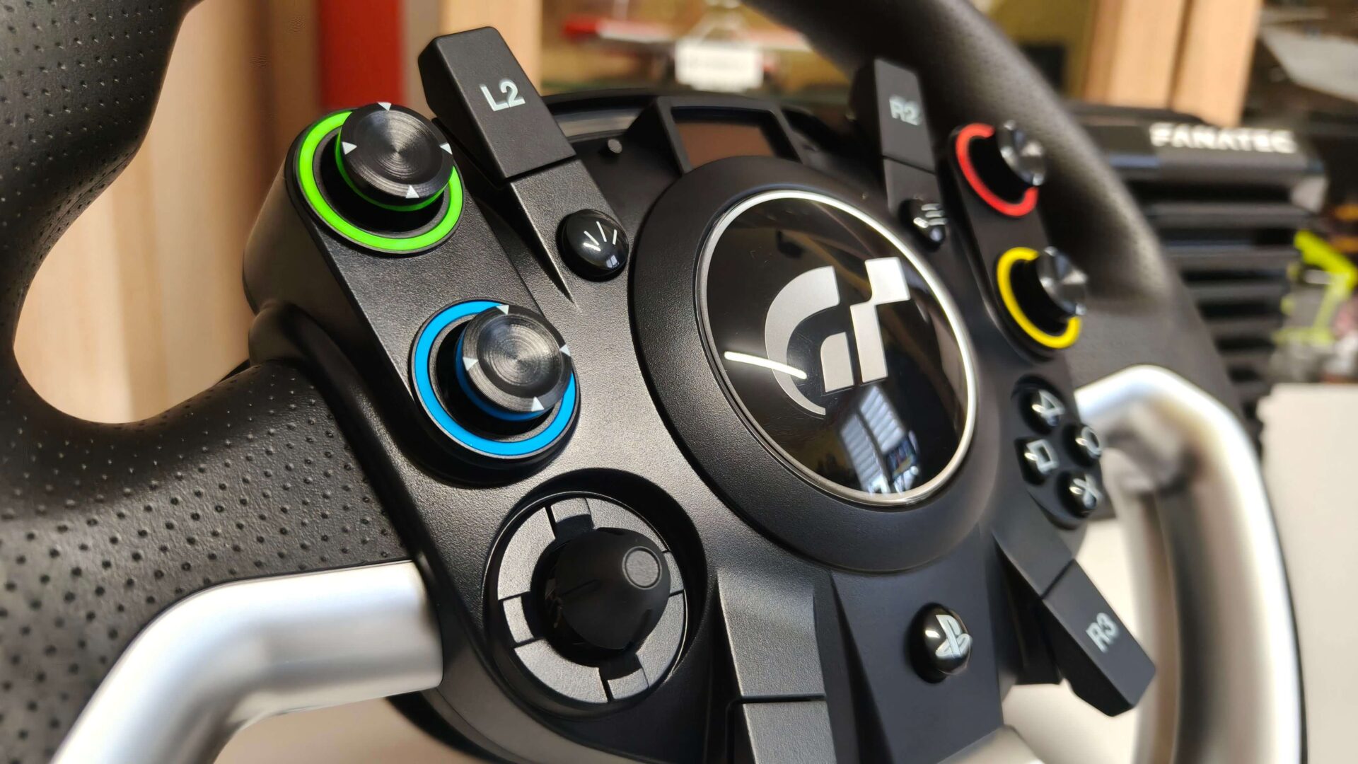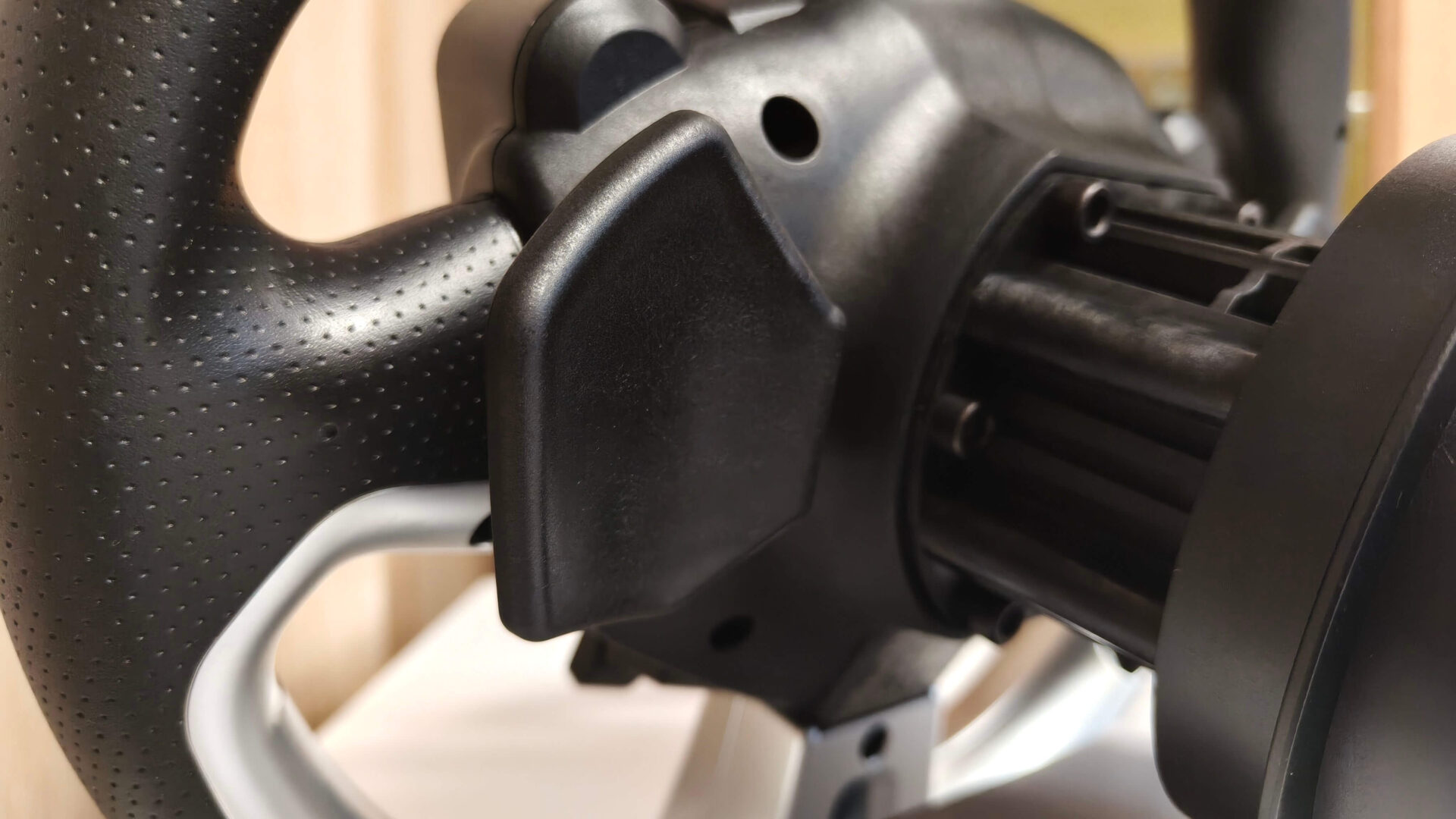 Niestety muszę wrzuć kamyk do ogródka Fanateca lub może choćby Polyphony Digital. Niestety nie ma na ten temat pełnej wiedzy, kto za to odpowiada, ale bardzo jestem rozczarowany łopatkami zmiany biegów. Mogę wybaczyć to, iż są plastikowe, a nie aluminiowe. Jednak nie rozumiem, dlaczego są tak małe – są niemal kwadratowe. Ich wymiar to 5 cm szerokości na 6 cm wysokości w najwyższym punkcie. Tak mały wymiar jest najbardziej dokuczliwy w dynamicznych grach wyścigowych, typu Dirt 5, czy Forza Horizon 5, gdy potrzebujemy wrzucić lub zrzucić bieg w zakręcie.