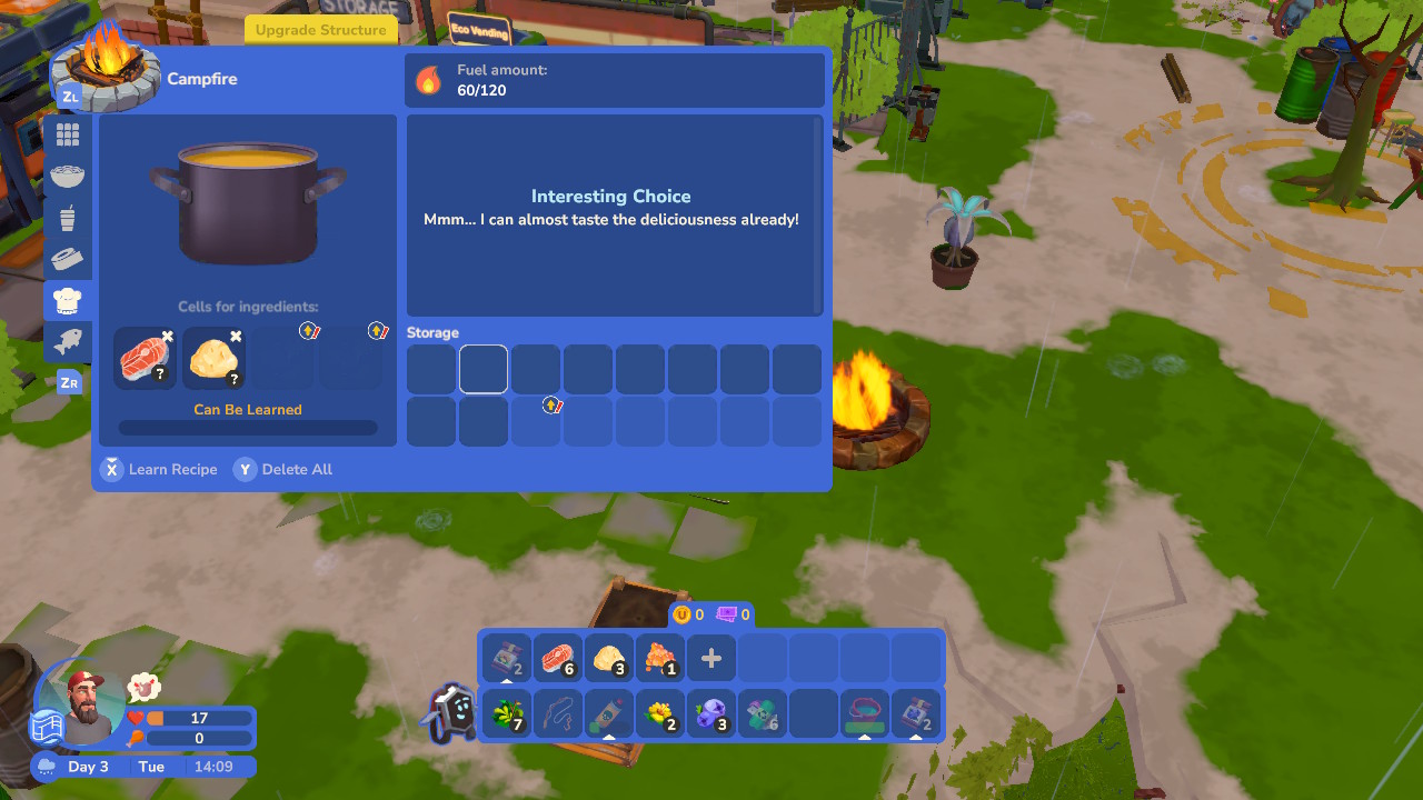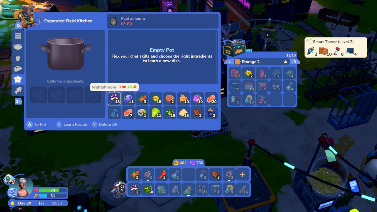 Dodatkowo, jeden warsztat (Farmer’s Table) robi niesamowite rzeczy, zarówno “przyjemne”, jak i katastroficzne. Z jednej strony pozwala na “replikowanie” dowolnych przedmiotów, o ile mamy ich przynajmniej dwa, z drugiej przy próbie posortowania, usunie nam całą zawartość skrzynki, poza pierwszym przedmiotem w niej. Ups. Szczególnie zabolało mnie to przy skrzynce pełnej nasion.