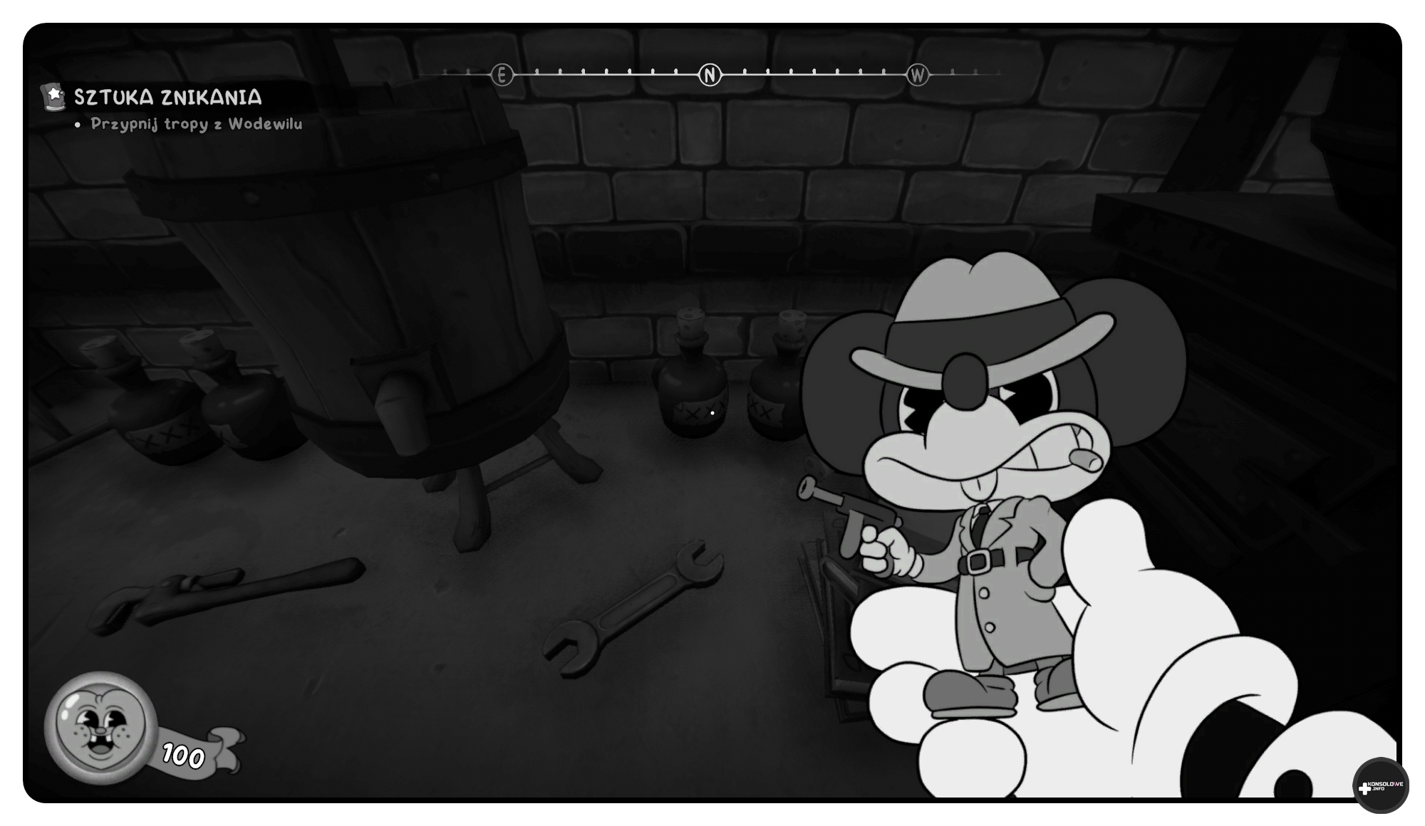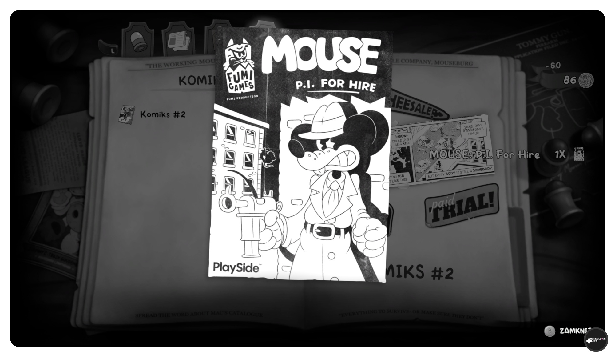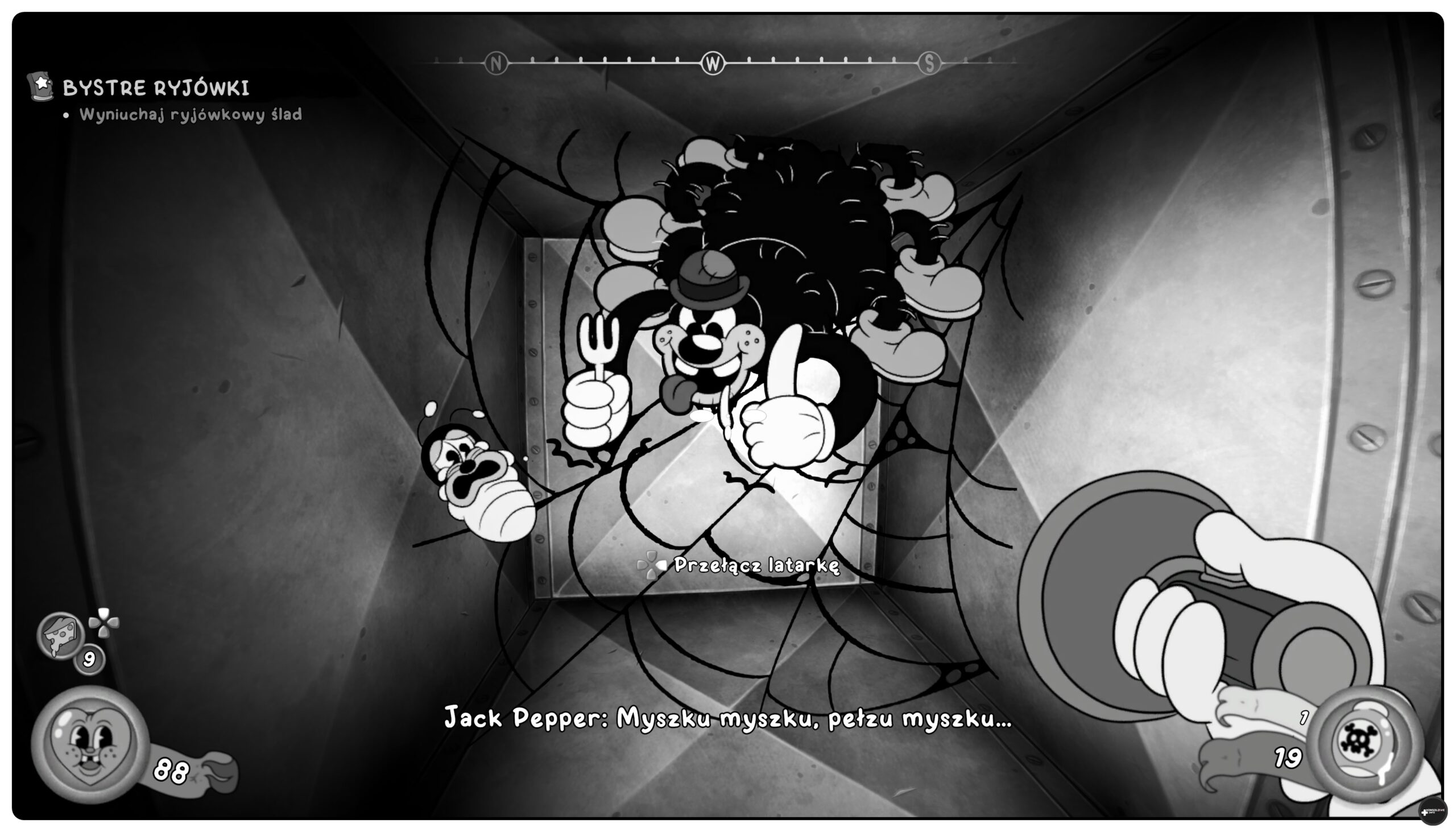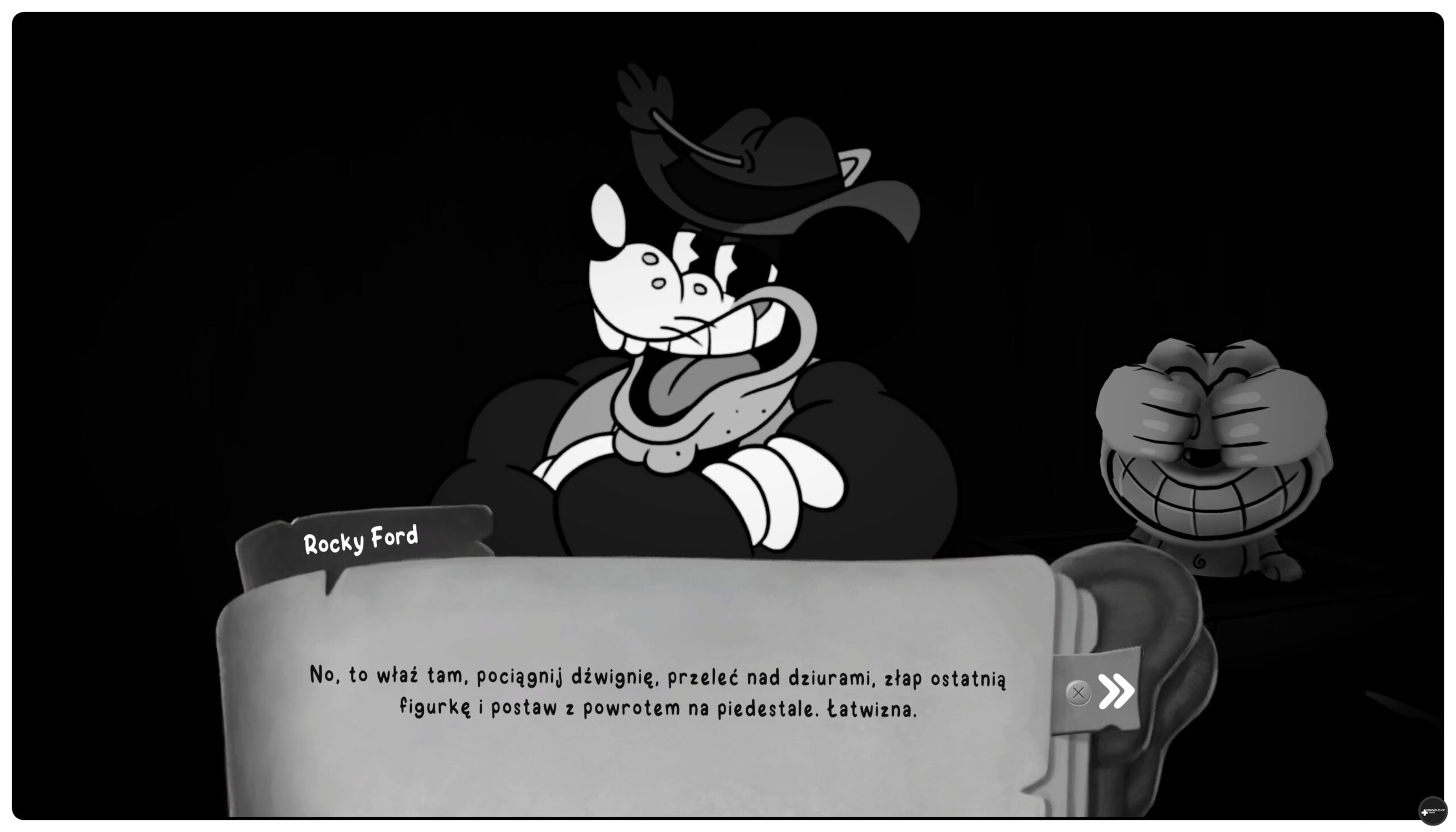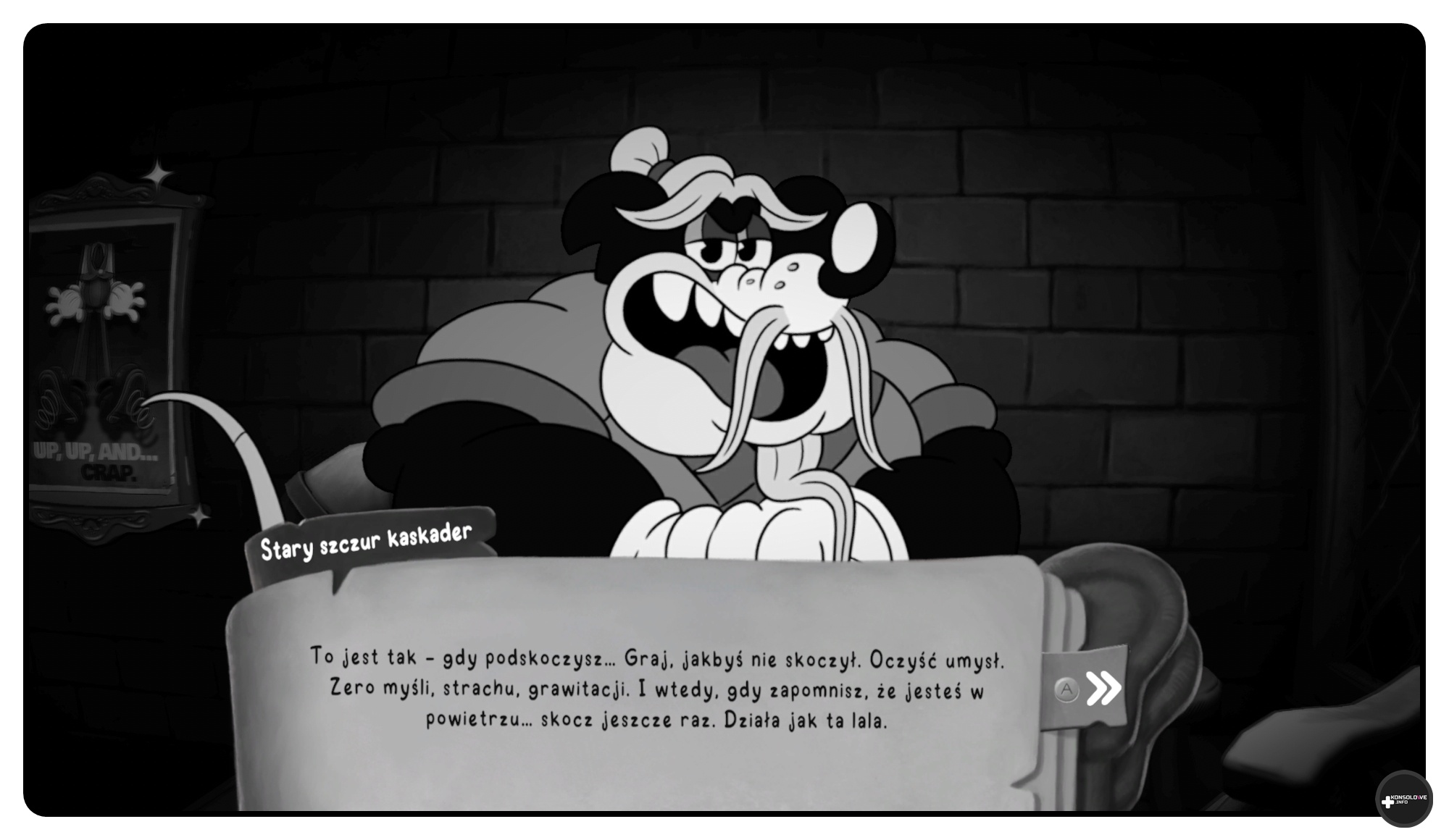 PS5Zacznijmy od tego, iż każda broń ma inny symbol amunicji, która często sama w sobie posyła nam groźne spojrzenie. Przedstawienie pocisków jako wyczekujące akcji postaci nieraz wywoływało uśmiech na mojej twarzy i sprawiało, iż byłem ciekaw kolejnej spluwy, jaką odblokuję. Fumi Games stara się też upodobnić swoją grę do czarno-białego komiksu (którego strony możemy nomen omen szukać w poziomach). Dlatego kiedy zbliżamy się do jakiejś postaci, to obraca się zawsze w naszą stronę, ukazując nam swoją płaską stronę. Natomiast po pokonanych przeciwnikach zostają – również obracające się ku nam – wielkie oczy na kupce popiołu. Nie mogę też nie docenić groteskowego wręcz wyginania się broni podczas przeładowywania ich. A co powiecie na otwieranie zamkniętych drzwi dzięki ogona naszego detektywa, czy na wykorzystanie tego ogona (po odblokowaniu tego fabularnie) do przelatywania niewielkich odległości niczym Rayman? Znajdzie się też coś dla fanów Indiany Jonesa. MOUSE: P.I. For Hire zaskakuje bardzo często i odkrywanie tej gry było dla mnie niesamowitą przyjemnością. Dużo dostrzegą na pewno gracze z Polski. Możemy się natknąć między innymi na gumkę do mazania firmy Matejko. Świetnie wypadają też odnajdywane notatki, czy reklamy.