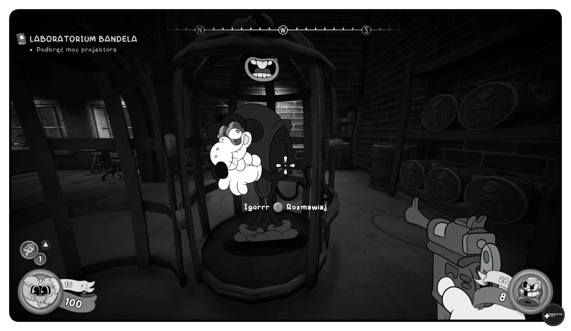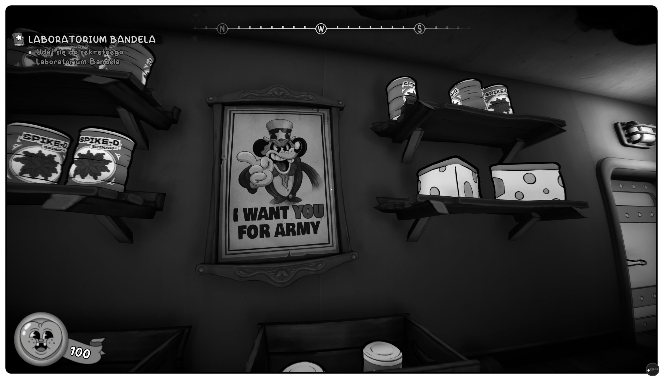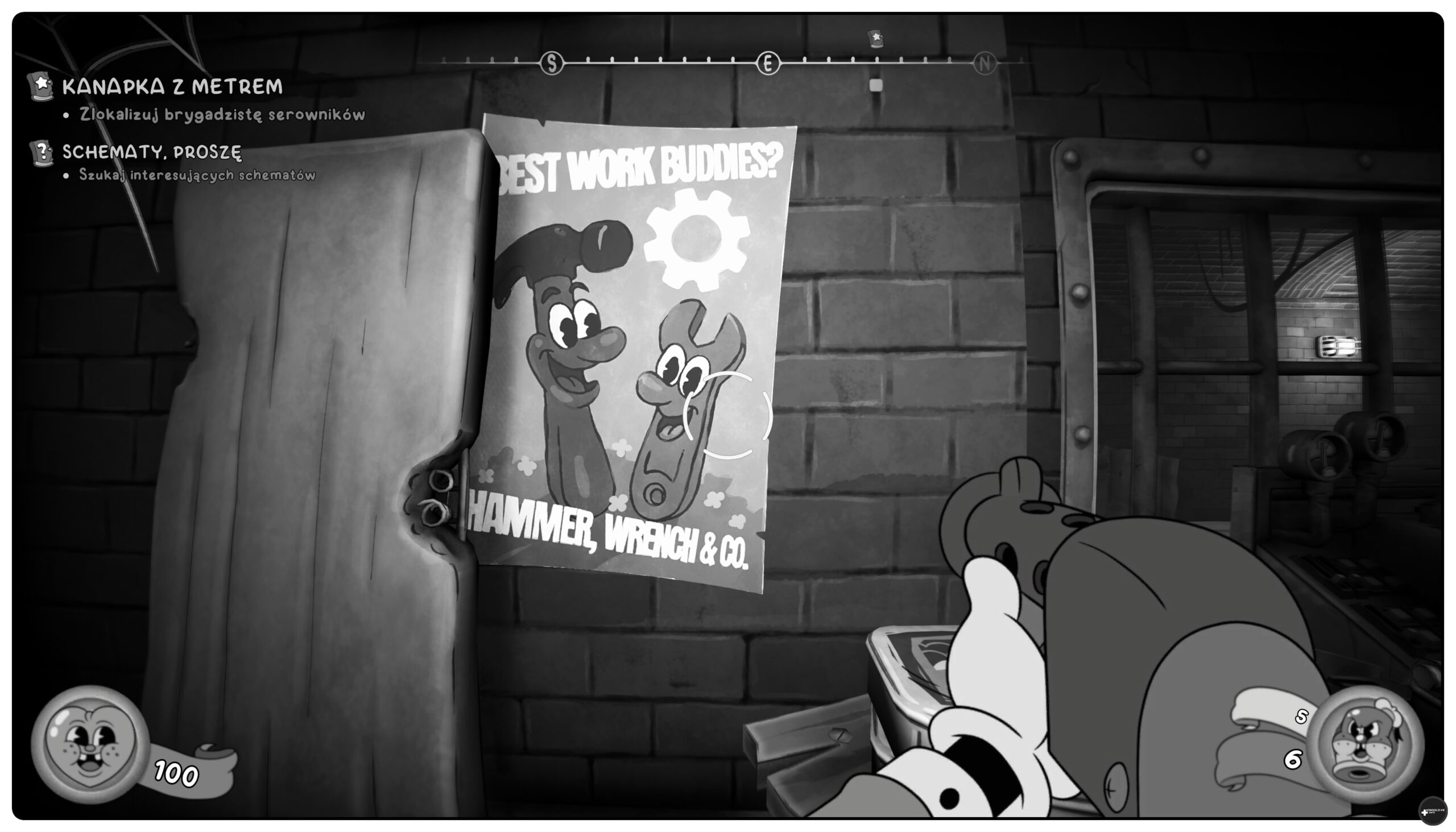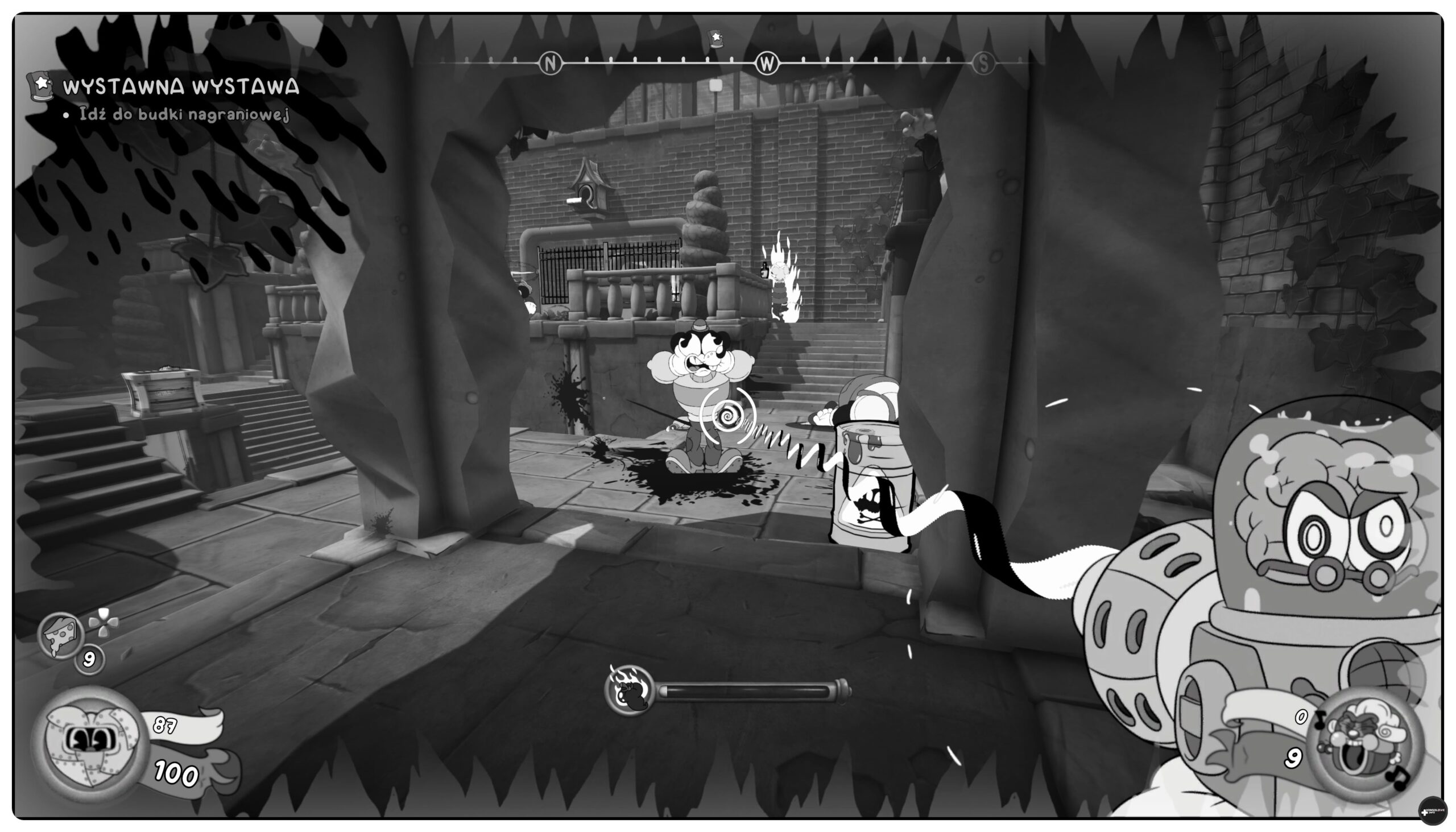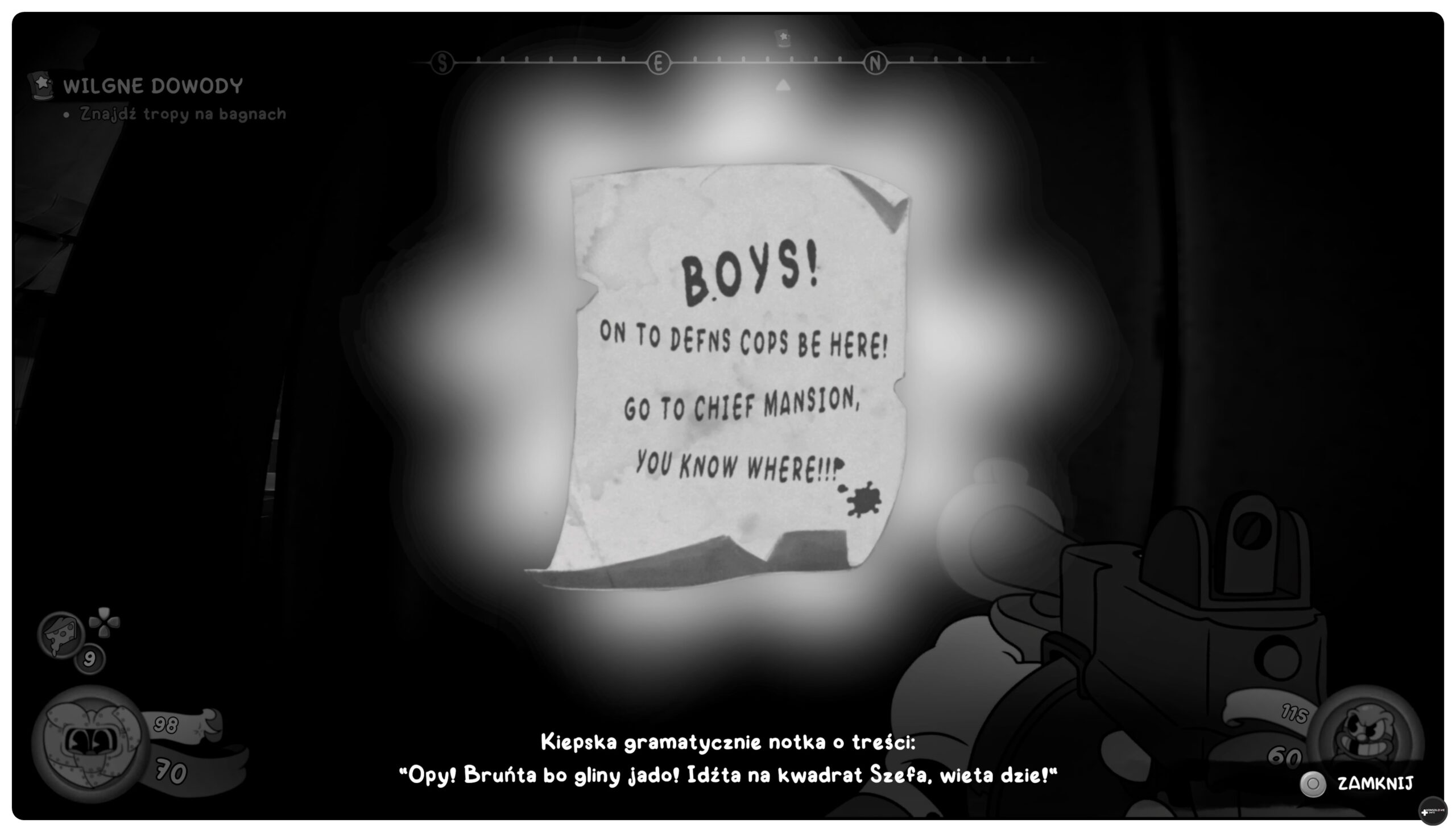 PS5Zacznijmy od tego, iż każda broń ma inny symbol amunicji, która często sama w sobie posyła nam groźne spojrzenie. Przedstawienie pocisków jako wyczekujące akcji postaci nieraz wywoływało uśmiech na mojej twarzy i sprawiało, iż byłem ciekaw kolejnej spluwy, jaką odblokuję. Fumi Games stara się też upodobnić swoją grę do czarno-białego komiksu (którego strony możemy nomen omen szukać w poziomach). Dlatego kiedy zbliżamy się do jakiejś postaci, to obraca się zawsze w naszą stronę, ukazując nam swoją płaską stronę. Natomiast po pokonanych przeciwnikach zostają – również obracające się ku nam – wielkie oczy na kupce popiołu. Nie mogę też nie docenić groteskowego wręcz wyginania się broni podczas przeładowywania ich. A co powiecie na otwieranie zamkniętych drzwi dzięki ogona naszego detektywa, czy na wykorzystanie tego ogona (po odblokowaniu tego fabularnie) do przelatywania niewielkich odległości niczym Rayman? Znajdzie się też coś dla fanów Indiany Jonesa. MOUSE: P.I. For Hire zaskakuje bardzo często i odkrywanie tej gry było dla mnie niesamowitą przyjemnością. Dużo dostrzegą na pewno gracze z Polski. Możemy się natknąć między innymi na gumkę do mazania firmy Matejko. Świetnie wypadają też odnajdywane notatki, czy reklamy.