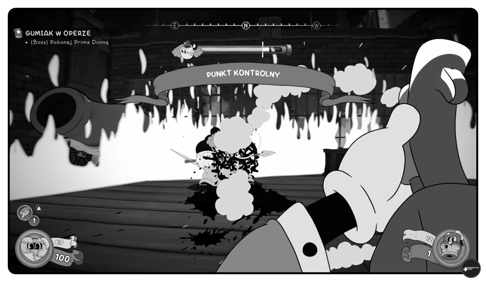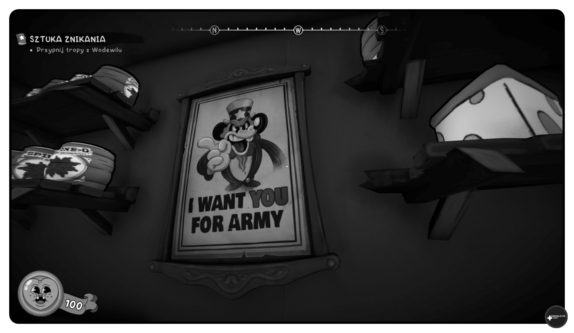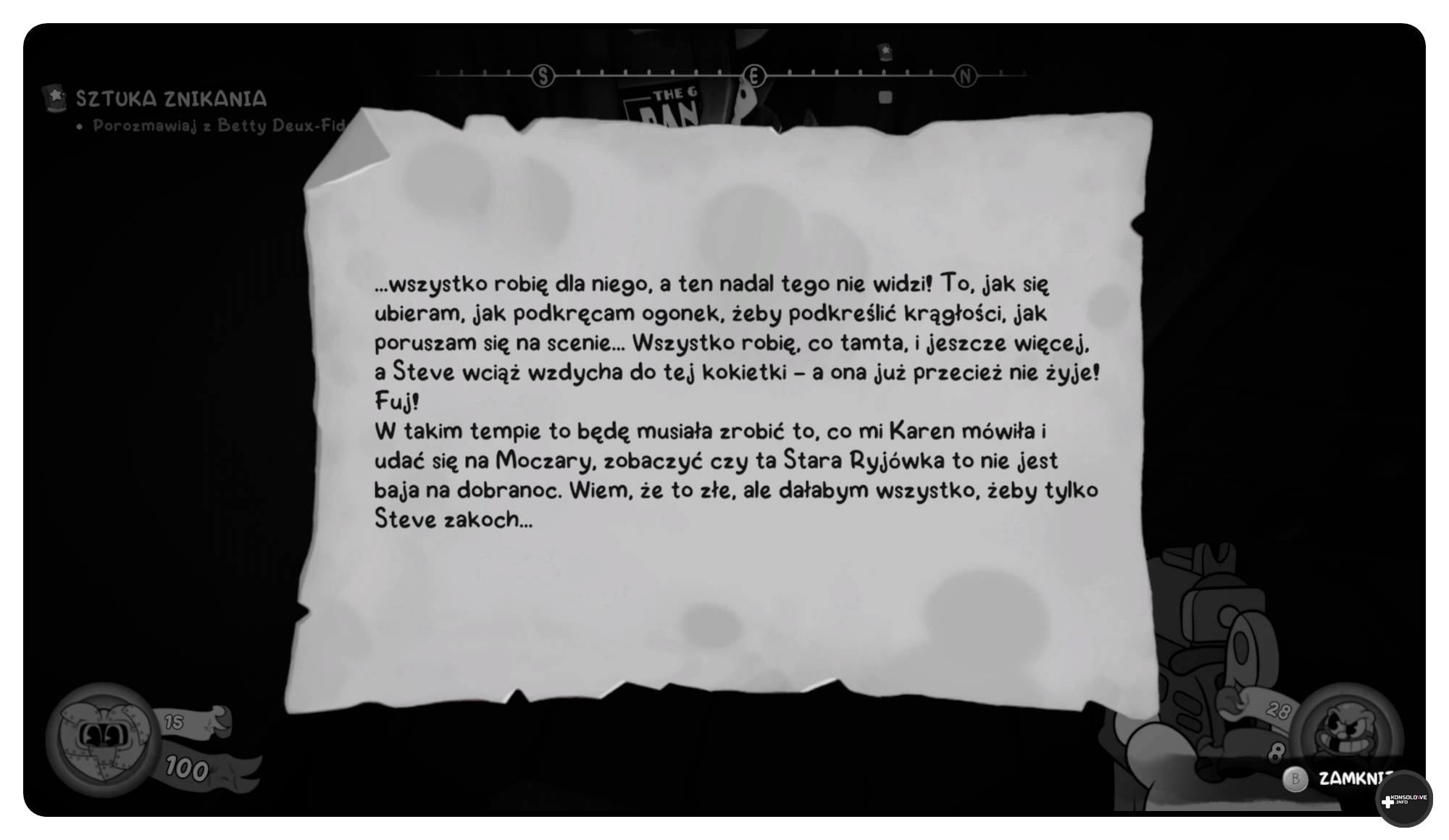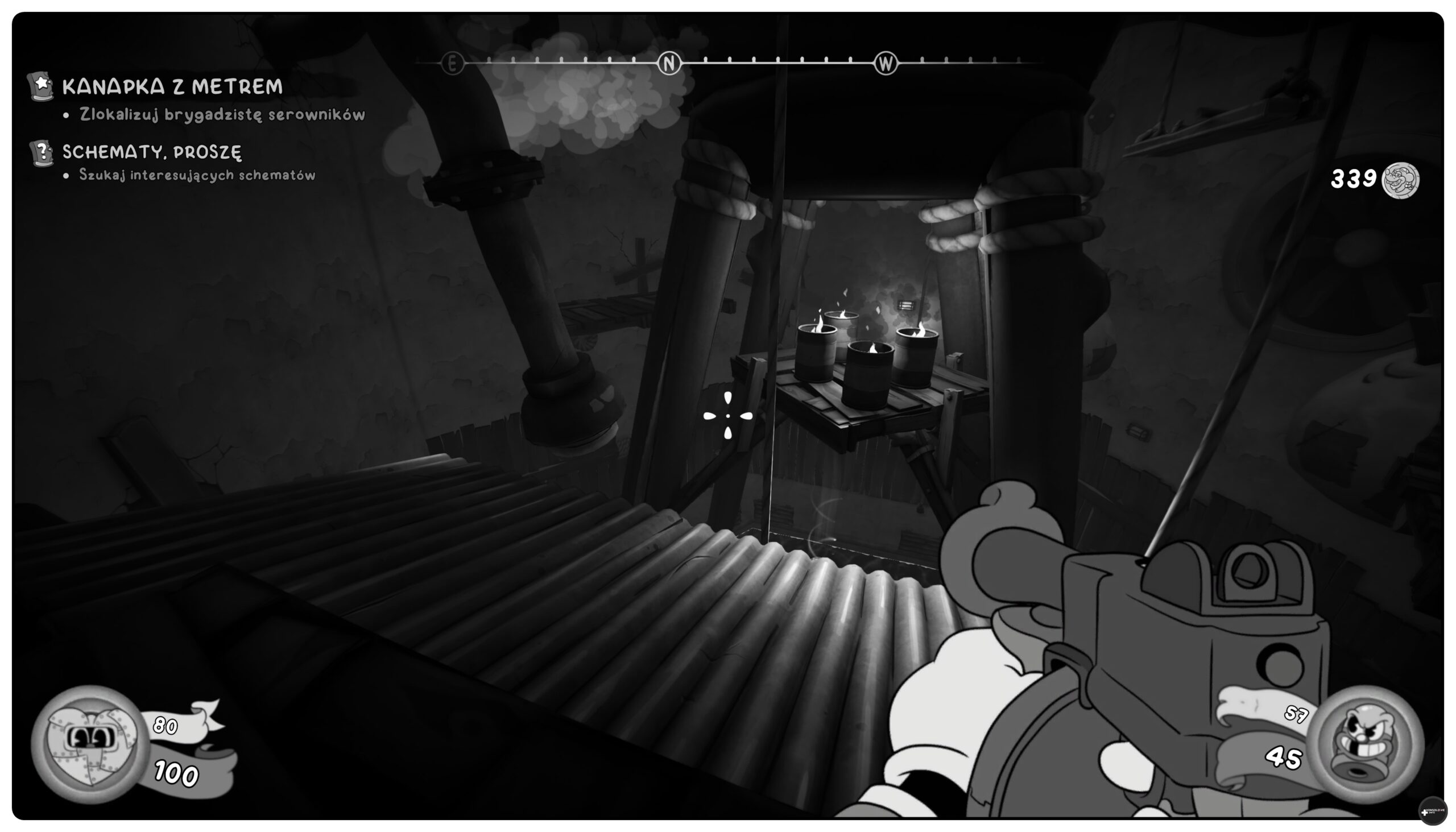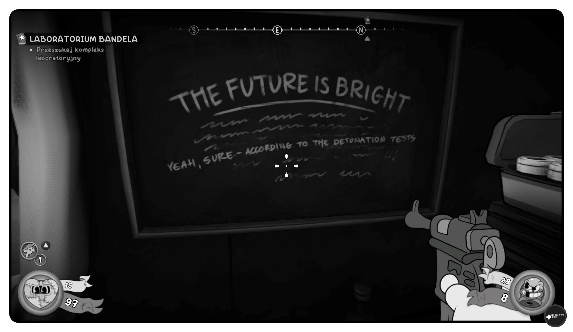 PS5Zacznijmy od tego, iż każda broń ma inny symbol amunicji, która często sama w sobie posyła nam groźne spojrzenie. Przedstawienie pocisków jako wyczekujące akcji postaci nieraz wywoływało uśmiech na mojej twarzy i sprawiało, iż byłem ciekaw kolejnej spluwy, jaką odblokuję. Fumi Games stara się też upodobnić swoją grę do czarno-białego komiksu (którego strony możemy nomen omen szukać w poziomach). Dlatego kiedy zbliżamy się do jakiejś postaci, to obraca się zawsze w naszą stronę, ukazując nam swoją płaską stronę. Natomiast po pokonanych przeciwnikach zostają – również obracające się ku nam – wielkie oczy na kupce popiołu. Nie mogę też nie docenić groteskowego wręcz wyginania się broni podczas przeładowywania ich. A co powiecie na otwieranie zamkniętych drzwi dzięki ogona naszego detektywa, czy na wykorzystanie tego ogona (po odblokowaniu tego fabularnie) do przelatywania niewielkich odległości niczym Rayman? Znajdzie się też coś dla fanów Indiany Jonesa. MOUSE: P.I. For Hire zaskakuje bardzo często i odkrywanie tej gry było dla mnie niesamowitą przyjemnością. Dużo dostrzegą na pewno gracze z Polski. Możemy się natknąć między innymi na gumkę do mazania firmy Matejko. Świetnie wypadają też odnajdywane notatki, czy reklamy.