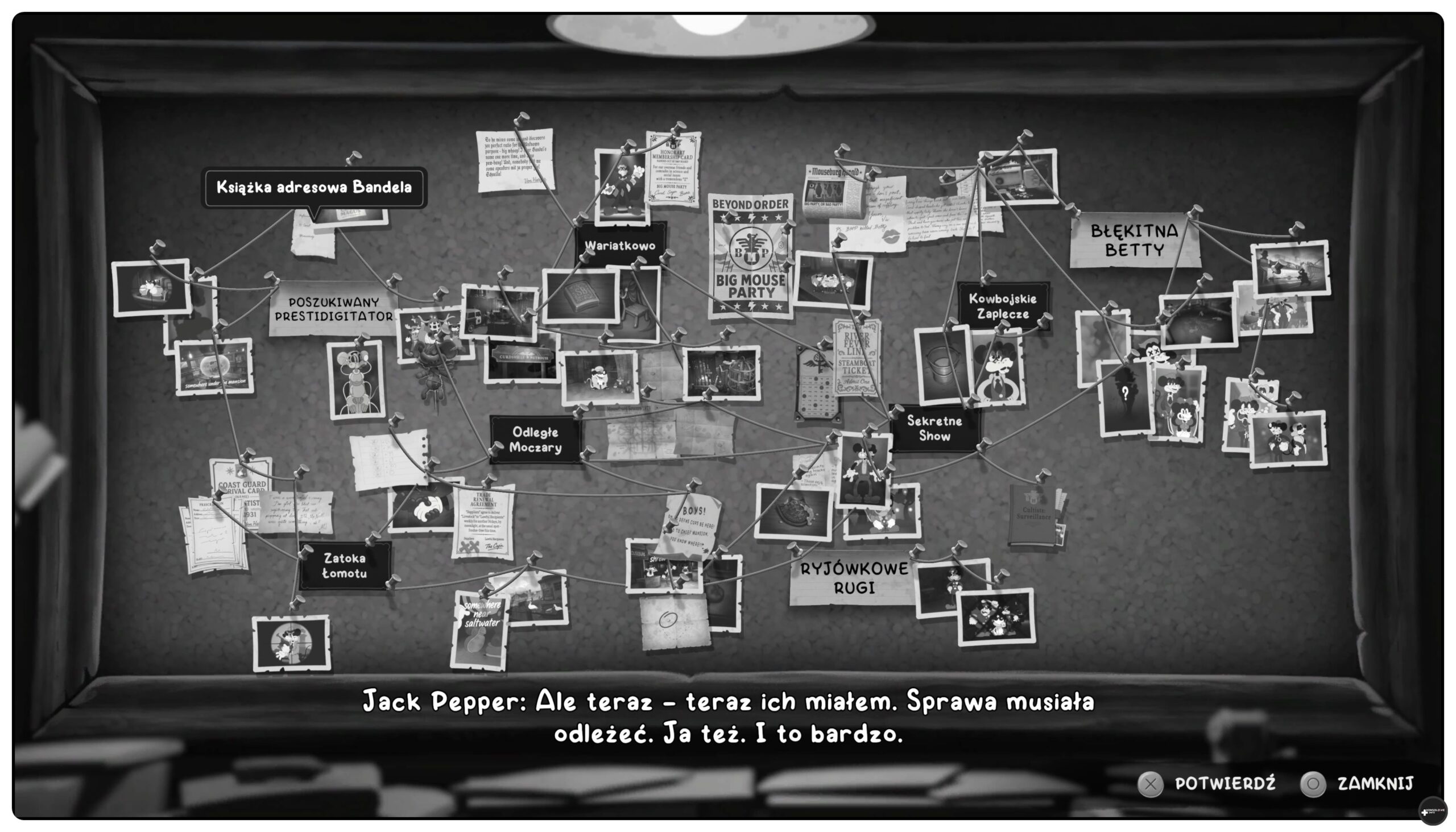 Nintendo Switch 2Kończąc pomału recenzję, nie mogę nie odnieść się oczywiście do udźwiękowienia w MOUSE: P.I. For Hire. Dźwięki postaci nagrano po angielsku i nie zdecydowano się na polski dubbing. Moim zdaniem jest to świetny wybór. Nie tylko dlatego, iż na ogół nie jestem prywatnie zwolennikiem pełnych polskich wersji językowych. W przypadku MYSZY uważam, iż bardzo trudno byłoby zastąpić fenomenalnego Troy’a Bakera. Aktor wciela się w głównego bohatera, Jacka Peppera, i słychać, iż świetnie czuł się w tej roli. Pepper jest nieco zgorzkniały, do-cna-noirowy. Cała obsada zresztą bardzo dobrze sprawdziła się w swoich rolach i nie ukrywam, iż słuchanie wypowiedzi aktorów sprawiało mi niemałą przyjemność. Zwłaszcza, iż często występowały odniesienia do popkultury (jednym z moich faworytów jest zdecydowanie Igorrr, koniecznie przez trzy „r” na końcu, ale nie zdradzę dlaczego). Bronie też brzmią bardzo przyzwoicie, choć im dźwiękom nie zaszkodziłoby nieco więcej głębi. Fantastyczna jest za to muzyka. Jazzowe wstawki (ale również utwory inspirowane klasycznymi animacjami) idealnie pasują do gry, a przy jej włączaniu słychać jak Jack nuci główny motyw przewodni tytułu. Możecie to zresztą usłyszeć niżej.
