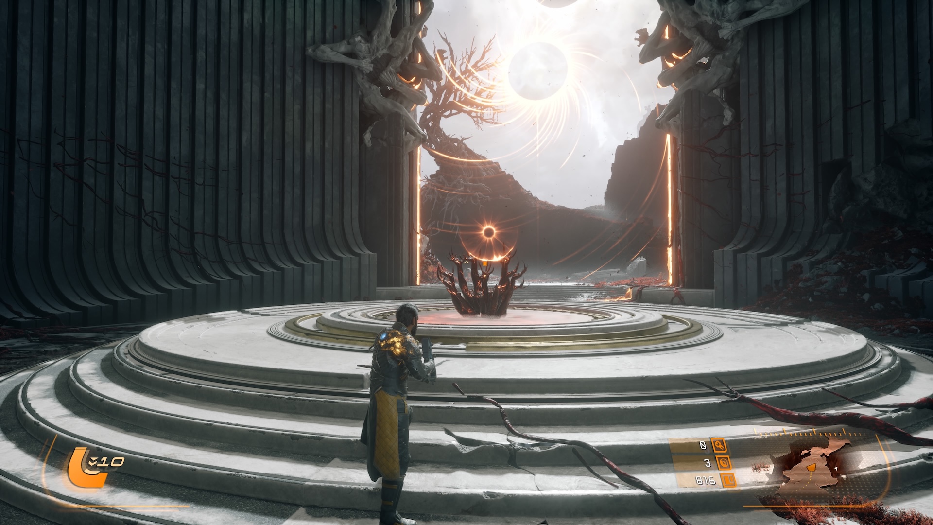 Główną ramą rozgrywki pozostaje tu mechanika pętli czasowej i wyruszania na kolejne wymagające wyprawy. Po każdej ekspedycji wracamy do Przejścia, w którym możemy wydać zgromadzony lucenit (porażka zmniejsza jego ilość). Walutę wydamy głównie na stałe ulepszenia dla Arjuna: więcej życia, pojemność tarcz i ilość pozyskiwanego kryształu.