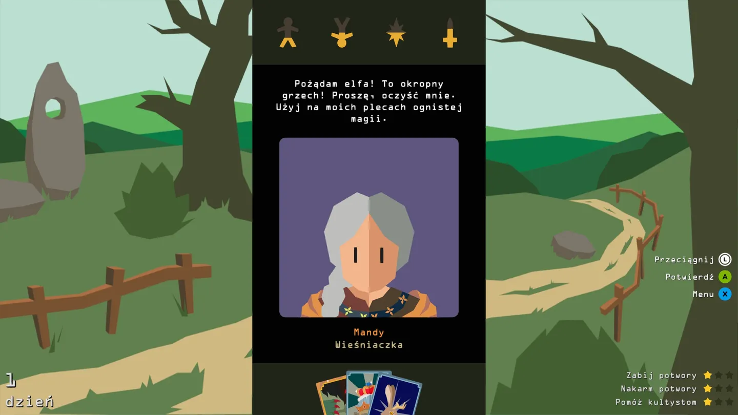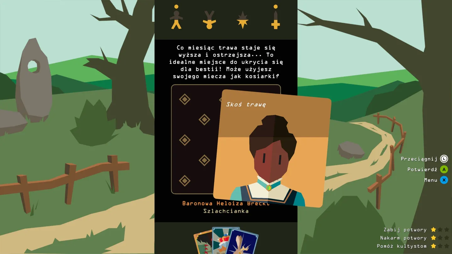 To jednak nie wszystko, co czeka nas na szlaku. Co jakiś czas wcielamy się w Jaskra i układamy balladę, która ma zadowolić konkretne osoby chcące usłyszeć na przykład o bogactwie, wypoczynku czy wielkiej przygodzie. Wówczas musimy dobrać z posiadanej puli kart te, które najlepiej pasują do oczekiwań słuchaczy. jeżeli nie zdołamy poprawnie ich dopasować, już po pierwszym wyborze wita nas taka fraza: „Może lepiej będzie, jeżeli pójdziesz spać… tam? Wskazują pobliskie drzewo. Kulisz się w jego cieniu i wyobrażasz sobie, iż jesteś gdzieś indziej, byle nie tutaj. No cóż, wielu jest innych podróżnych na szlaku…”